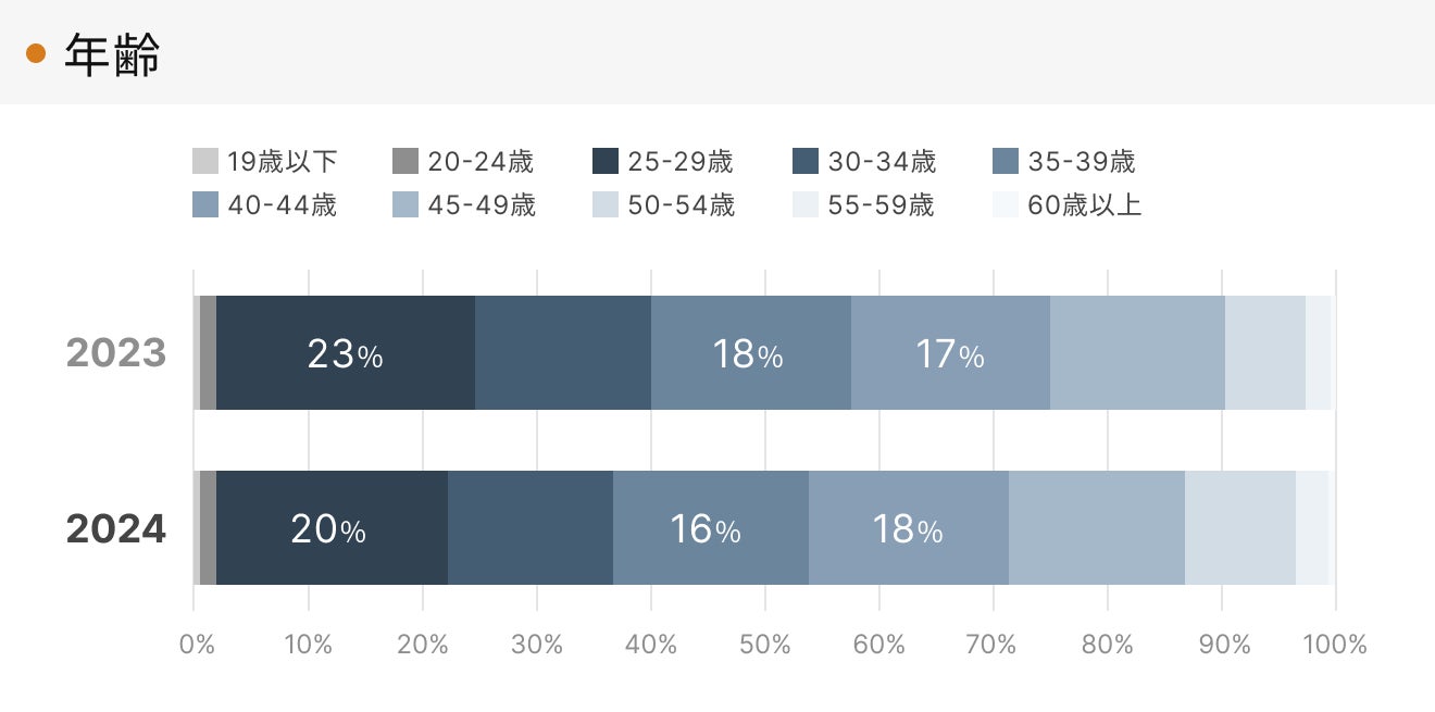 最も割合の多い年齢帯は25〜29歳で20%、次に多い割合は40〜44歳の18%、35〜44歳の16%と続きます。2023年度と比較すると40代以上の割合が高くなり、各年齢帯の割合の差が小さくなっています。