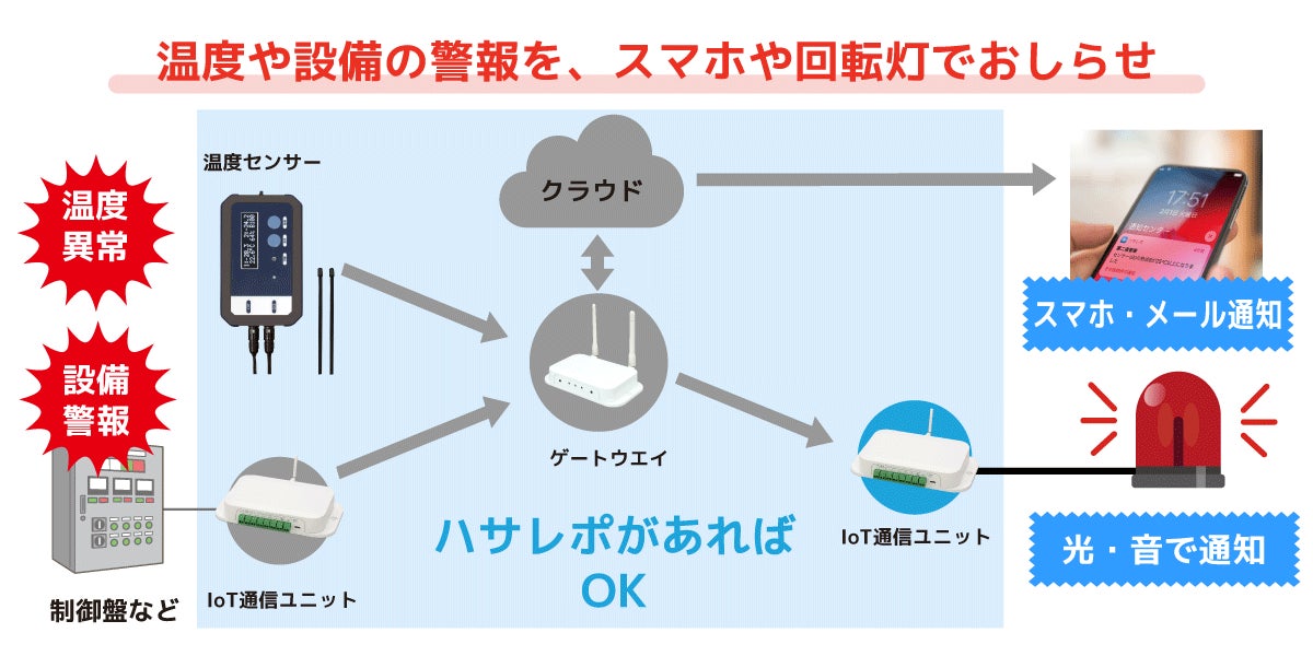 ハサレポは、冷蔵庫などの温度を自動記録し、異常をスマホ通知やメールで知らせるIoTシステムです。本機能により、現場の回転灯やブザーを使った通知が可能になりました。LAN接続が不要なハサレポなら、配線や社内ネットワークの制約で設置が困難だった場所にも、容易にアラート環境を構築できるようになります。