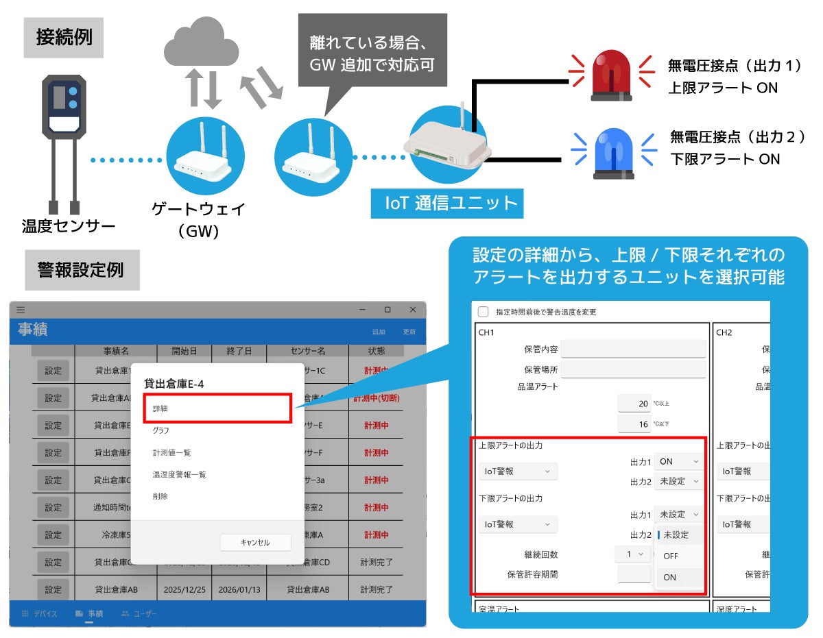 今回のアップデートにより、温度が指定範囲を逸脱したときの報知手段として、現場の回転灯(光)やブザー(音)による警告に対応いたしました。今まではスマホへのプッシュ通知やメール通知で異常をお知らせしていましたが、今回はそれに加えて、IoT通信ユニットを使った回転灯などでの通知が可能になりました。