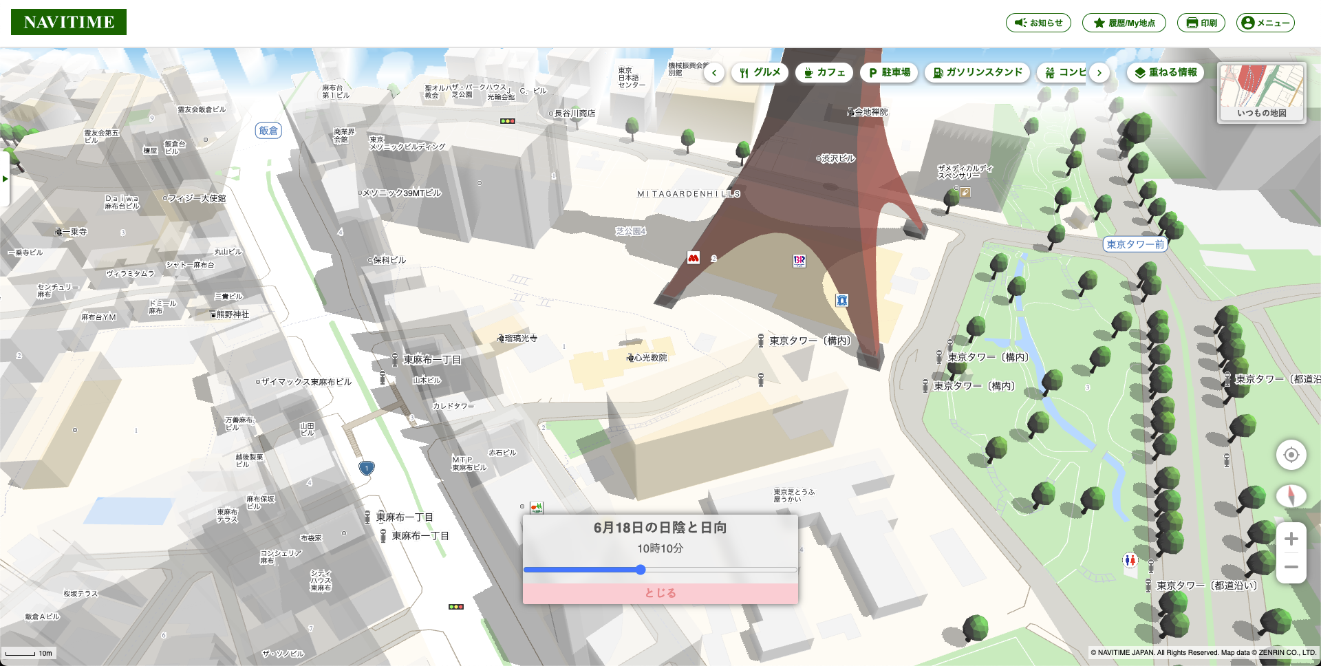 建物、街路樹、3Dランドマークの日陰情報を地図上に重ねて表示し、画面下のスクロールバーを左右に動かすと、その日(0時~24時まで)の10分ごとの日陰の変化をご確認いただけます。