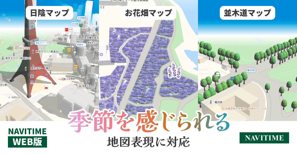 『NAVITIME』Web版、季節を感じられる地図表現に対応、「日陰マップ」、「並木道マップ」、「お花畑マップ」を提供開始