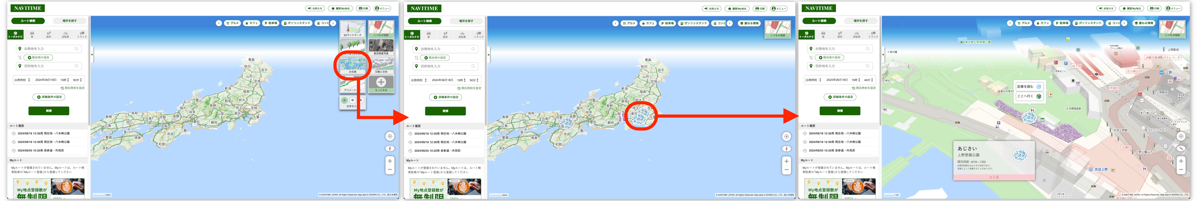 開花に合わせて3Dアニメーションで花畑を動的に表現します。花畑上のアイコンからそのスポットの詳細情報を確認でき、また旅行プランニング&予約『NAVITIME Travel』サイトと連携しているため、関連する旅行ガイド記事を閲覧することも可能です。