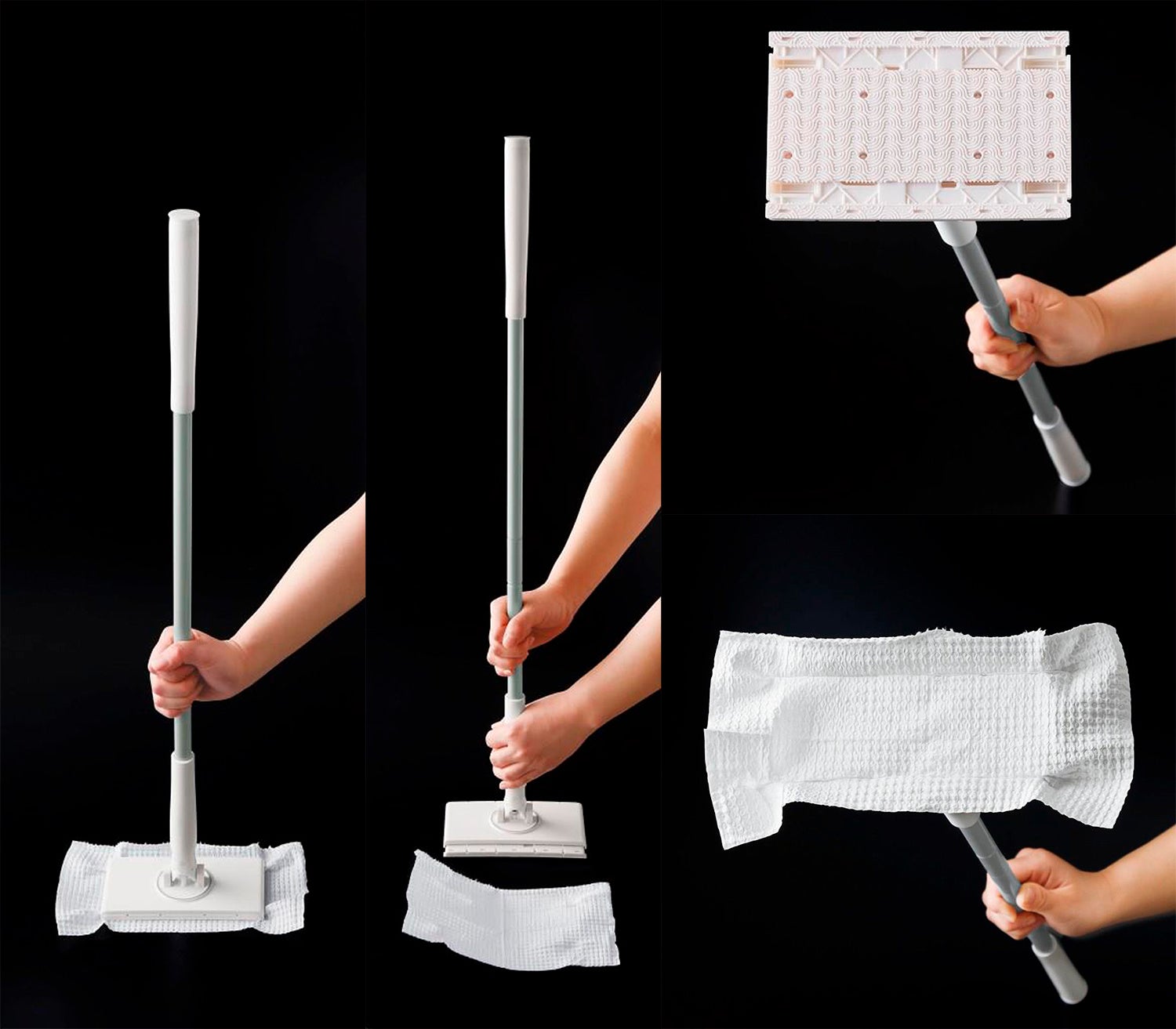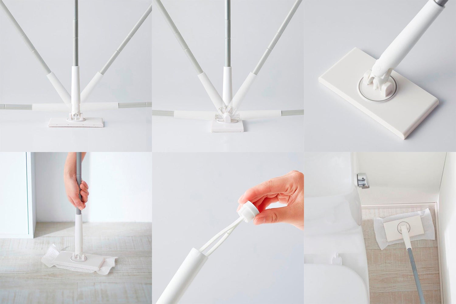 ヘッドをシートの中央に置き、床面に対して垂直に押し込むだけ!ヘッド部分がシートをしっかり挟んで簡単に取り付け完了!シートを外す時は、本体の根元部分を、もう片方の手で持ち手部分を引くだけで、シートに触らずに捨てられます。