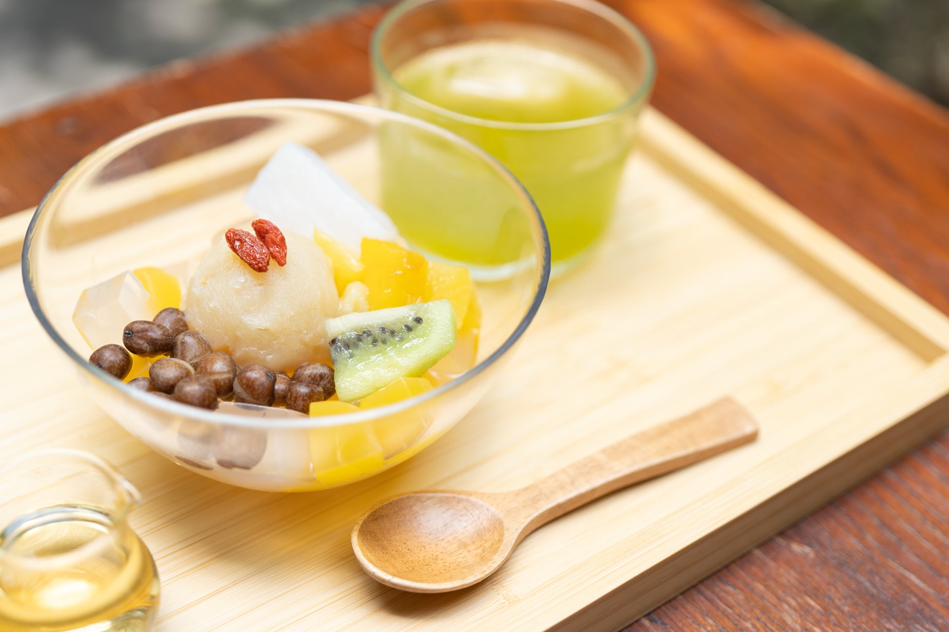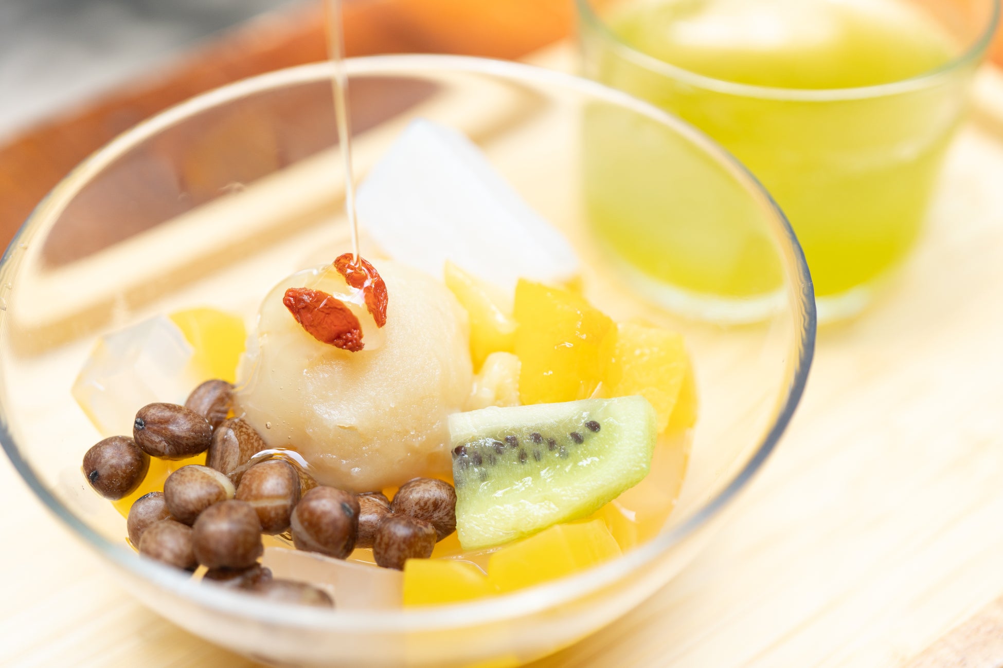 強い日差しと蒸し暑さで食欲が落ちる夏でも、見た目も味わいもさっぱりと楽しめるよう、柑橘系フルーツをふんだんに使用した夏仕様のあんみつ。ピール入りのレモン餡や、風味の異なる2種類の寒天、フレッシュなフルーツに、白蜜を添えて。甘さも調整しやすく、幅広い世代の方におすすめできる涼菓です。