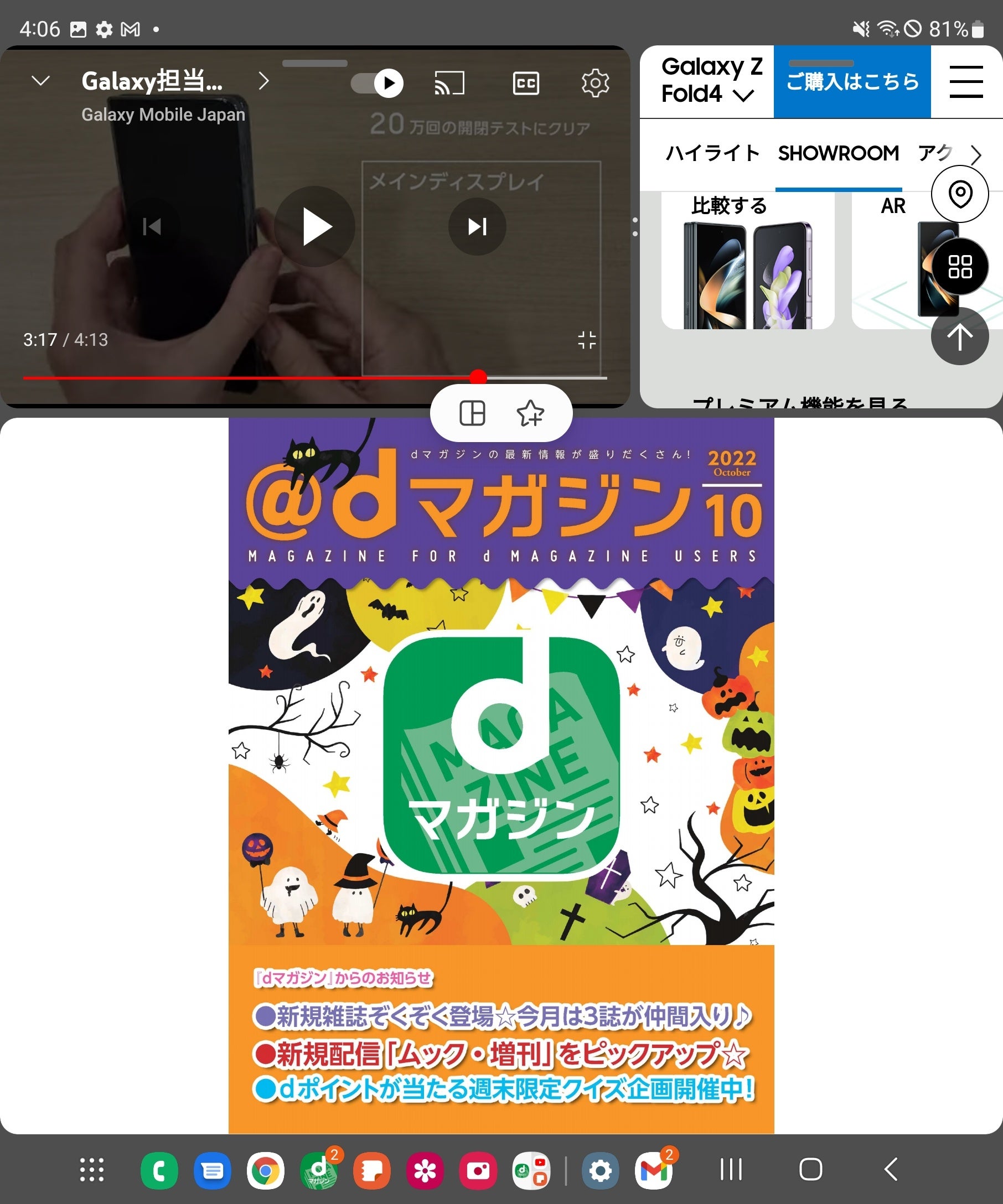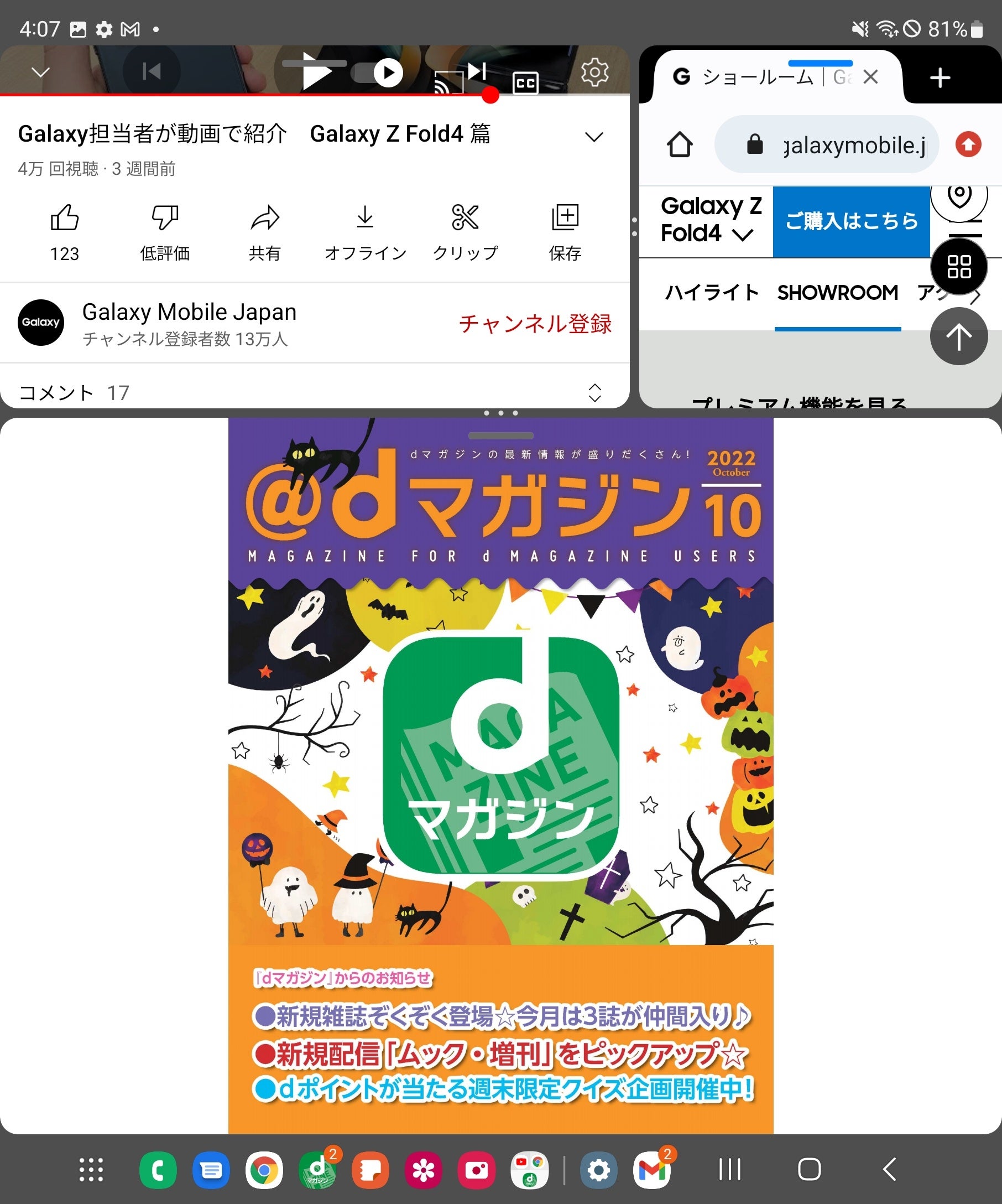 上記のように、左に「dマガジン」、右上に「YouTube」、右下にメモアプリ「Galaxy Notes」等、最大3画面分割が可能です。