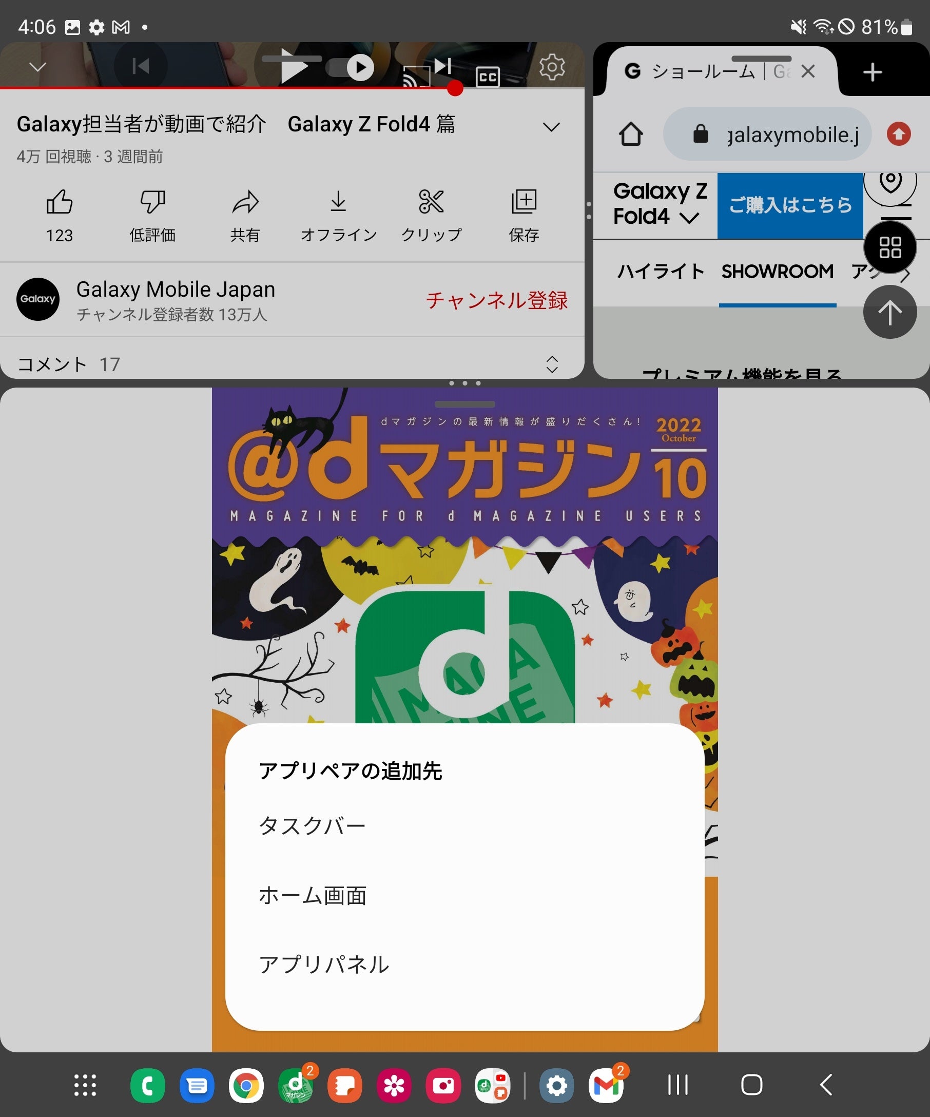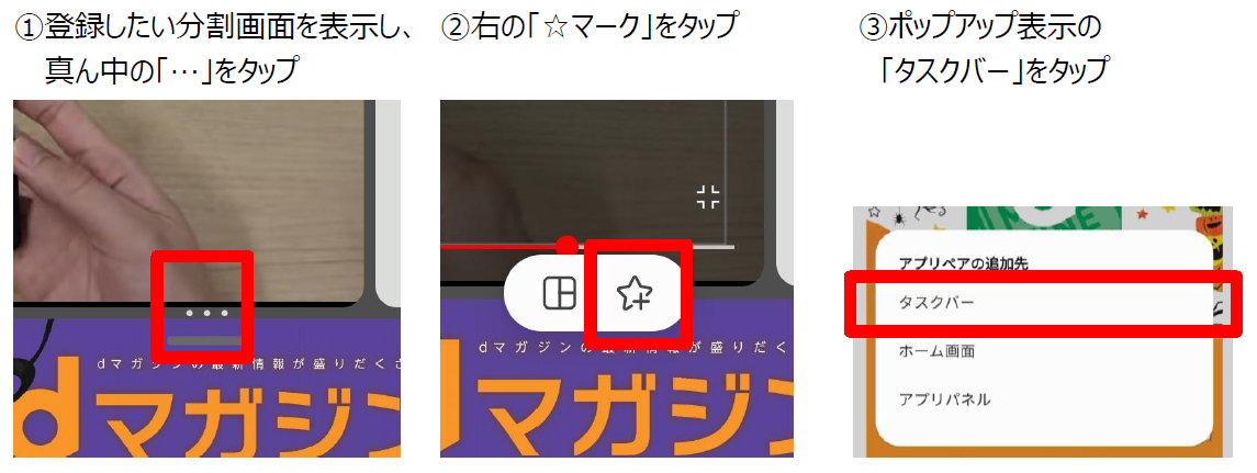 また、「Galaxy Z Fold4」に新しく搭載された画面下部の「タスクバー」にdマガジンを登録することも可能で、3ステップの簡単な設定を行うと、1タップでお気に入りの分割画面を表示することもできます。さらに、大画面ではジェスチャー(2本指で画面の左からなぞる)による画面分割にも対応しています。