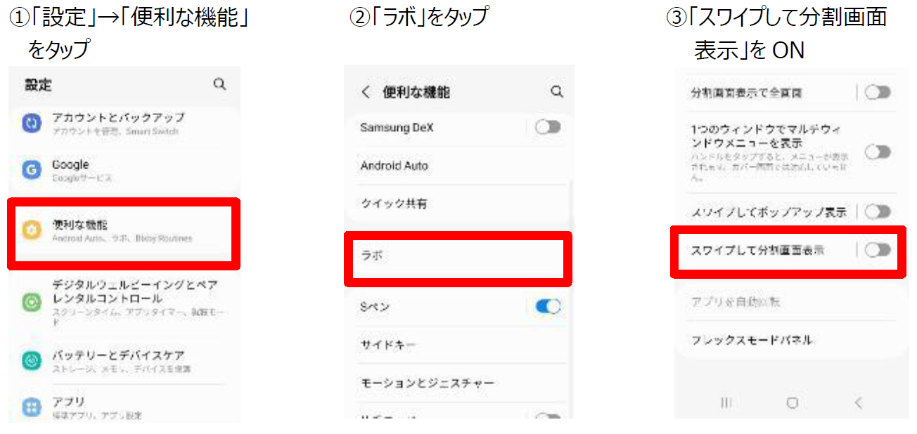 <ジェスチャー(2本指で画面の左からなぞる)による画面分割設定方法>