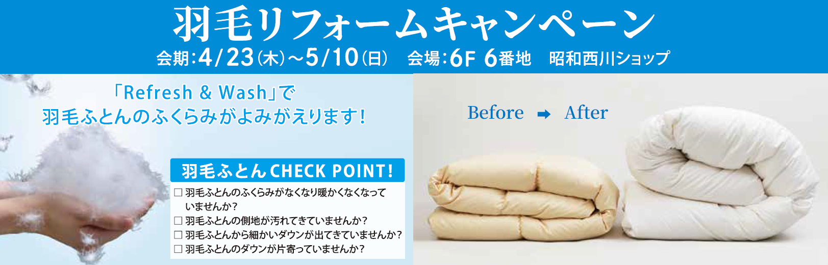 また、期間中は対象商品の特別販売のほか羽毛ふとんのリフォームキャンペーンも同時開催します。