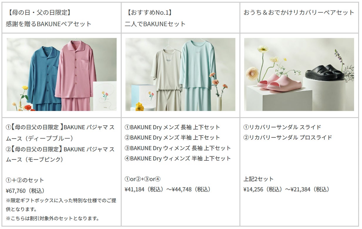 キャンペーン期間中は、税込5,000円以上のご購入で、全商品対象のギフトラッピングを無料でご提供いたします。さらに、対象商品税込30,000円以上ご購入のお客様には、1日の終わりに自分を労わるバスタイムをサポートし、おやすみ前の環境を整える重炭酸入浴剤「BAKUNE BATH (9錠)」を ノベルティとしてプレゼントいたします。また、母の日・父の日限定カラーの「BAKUNEパジャマ スムース」をご購入いただいた方には、大切な人への想いを上質な贈り物として届けるための限定ギフトボックス(有料)をご用意しております。