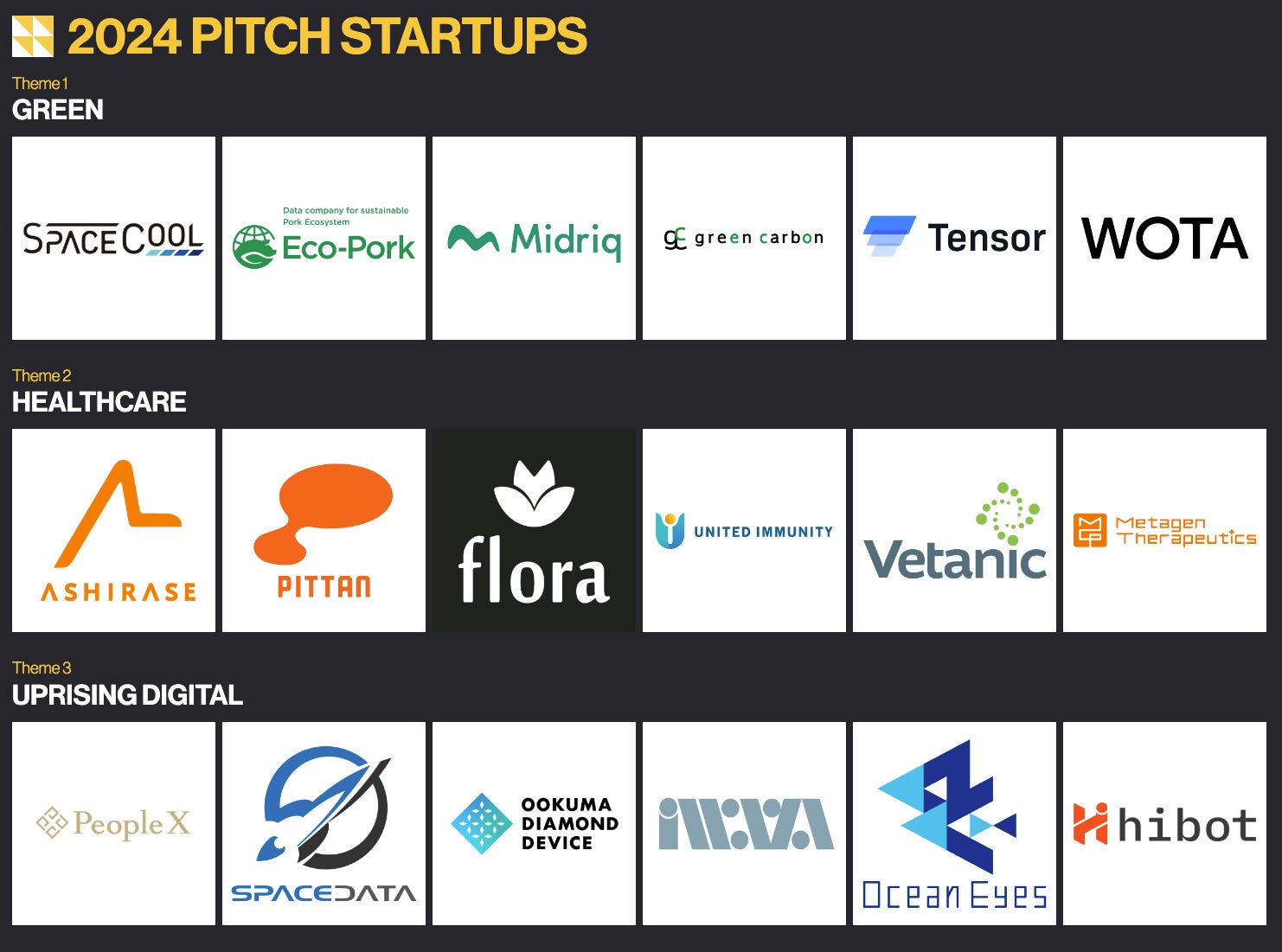 「大きな事業成長に挑むスタートアップと世界の架け橋になること」を目指す、グローバルなピッチステージです。国内外から100名以上の審査員が揃い、世界の舞台でも成功の可能性を秘めたスタートアップと向き合います。全てのピッチは英語に同時通訳され、全世界に向けて配信されます。「GREEN」、「HEALTHCARE」、「UPRISING DIGITAL」の3つのテーマに分かれ選ばれたスタートアップ企業がピッチを行います。
