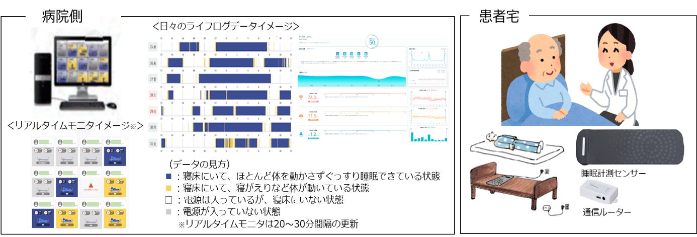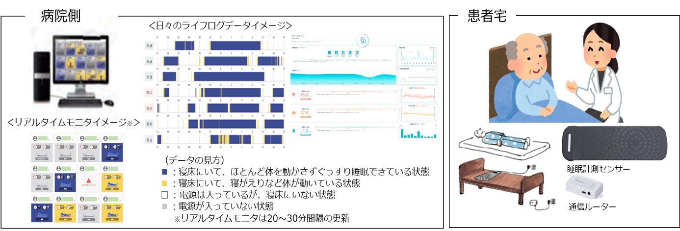 睡眠計測センサーを活用し、在宅患者の体調把握のため、ライフログデータを日々収集。また、日々の見守りや、夜間に長時間ベッドから離床されている患者・在宅高齢者等の訪問判断等を実施しました。