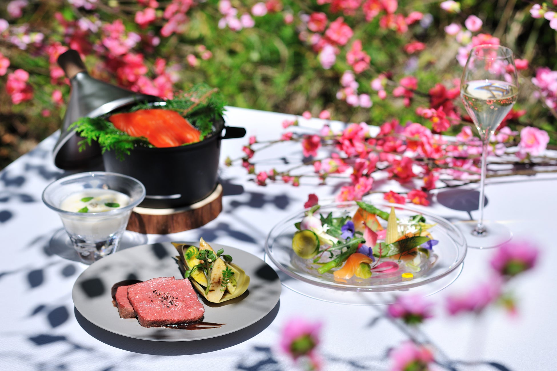 桃に囲まれた特別席で楽しむのは、グランピングマスターと一緒に仕上げるコース料理とワインペアリングです。ダッチオーブンやスモーカーなどのアウトドア器具を使いながら、桃の木から得られる恵みをふんだんに使用した料理を提供します。桃の果実は、スープやデザートでその豊かな香りや甘みを味わい、また、メインでは、マスタードと合わせたソースで、牛肉の旨味を引き出します。美味しい果実を実らせるために青い状態で採られる若桃は、甘露煮にし、リコッタチーズと合わせて爽やかな一品に仕上げました。さらに、桃の木はチップにして大鱒の燻製に使用し、香りを楽しみます。美しく咲き誇る桃の花に囲まれながら、桃のさまざまな味わいが詰まったランチを味わい、優雅なひとときを過ごします。