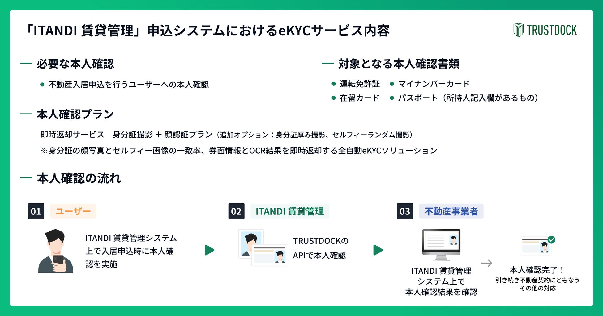 株式会社TRUSTDOCK (東京都千代田区、代表取締役:千葉 孝浩、以下TRUSTDOCK) は、2025年11月より、イタンジ株式会社 (東京都港区、代表取締役 社長執行役員 CEO:永嶋章弘、以下イタンジ) が展開する不動産賃貸管理会社向け業務支援サービス「ITANDI 賃貸管理」の申込システムと、eKYC (オンライン本人確認) サービス「TRUSTDOCK」の連携を開始いたします。
