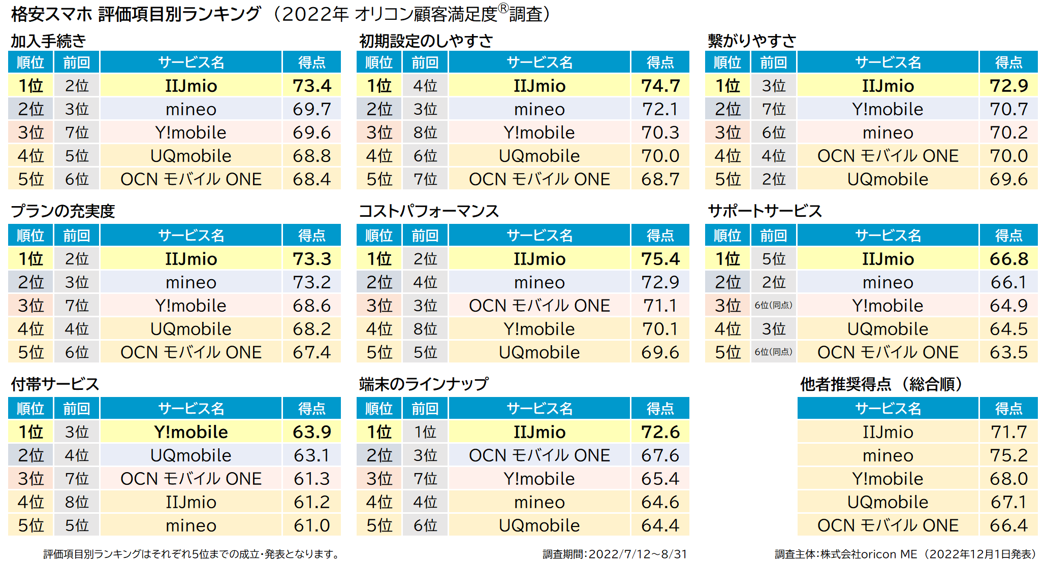 - ■格安スマホ(SIM+端末セット)は【IIJmio】が初の総合1位に ~評価項目別ランキングでも8項目中7項目で1位に~