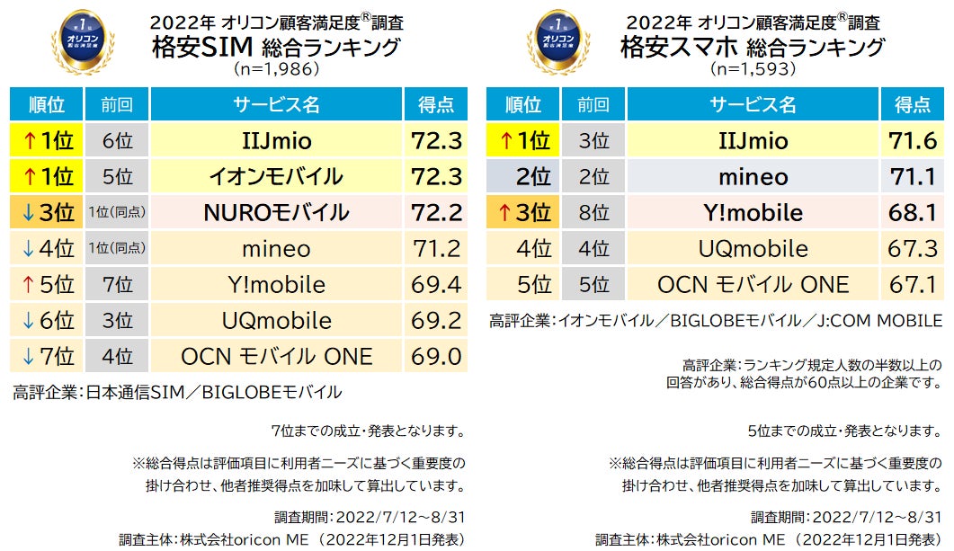 今回、格安SIM(SIM単体)、格安スマホ(SIM+端末セット)ともに【IIJmio】が総合1位を獲得しました。