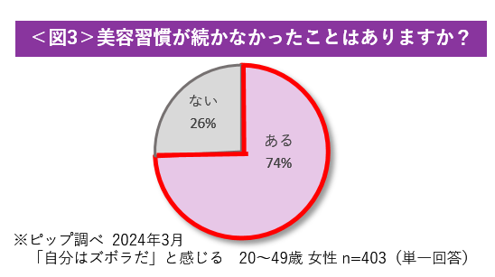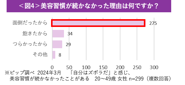 さらに、「美容習慣が続かなかったことはありますか?」という問いに対して、ズボラを自覚している女性のうち74%が「ある」と回答しています<図3>。美容習慣が続かなかった理由としては、9割以上が「面倒だったから」と回答しており、最も多い結果です<図4>。「面倒さ」を感じることが、女性の美容習慣の継続を困難にしている大きな原因の一つであることが伺えます。