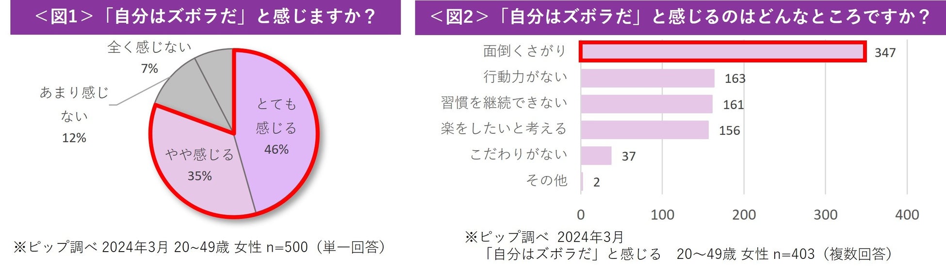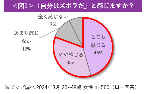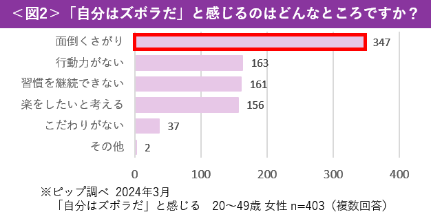 ピップの調査によると、20~40代の女性500名のうち81%が「自分はズボラだ」と感じていることが判明しました<図1>。ズボラを自覚している女性に、ズボラだと感じる部分を調査したところ、86%が「面倒くさがり」であることを選択しており、「ズボラ=面倒くさがり」のイメージが定着していることが伺えます<図2>。