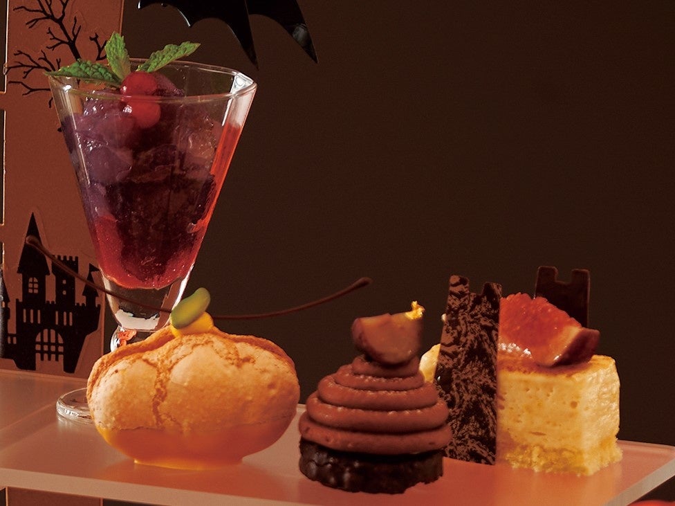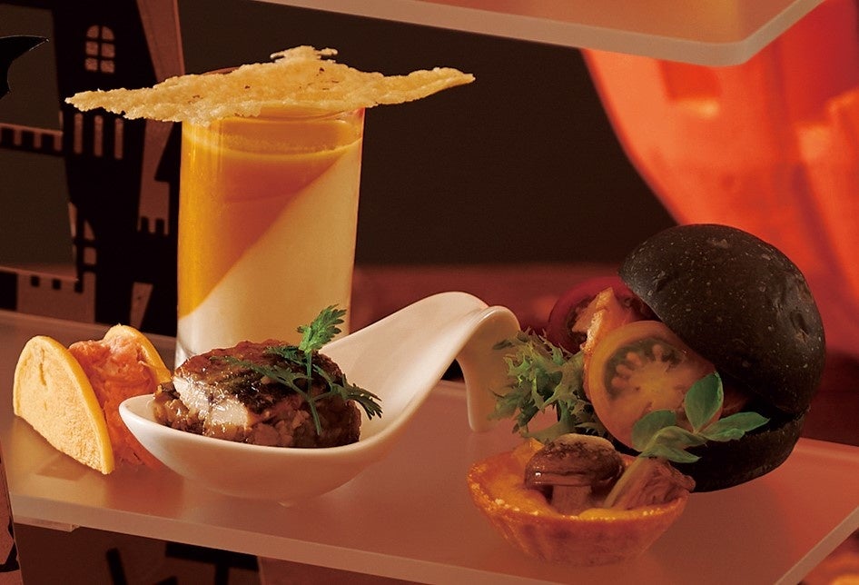 かぼちゃのビスキュイ・ア・ラ・キュイエール、モンブランマロン、ナスとサンマのテリーヌなど、秋の食材を使用したスイーツやセイボリーが勢揃い。アフタヌーンティースタンドには黒猫やコウモリなど、お菓子をもらいに集まってきたキャラクターの装飾を施し、ハロウィン仕様に仕立てました。