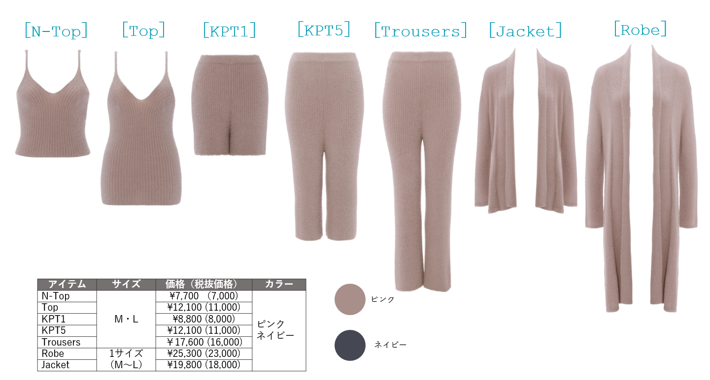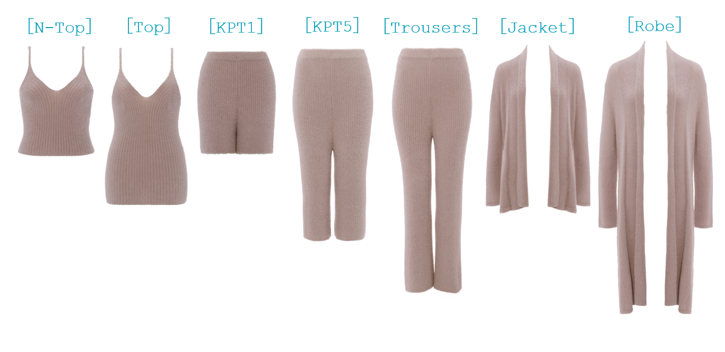 ファーモールヤーンのふわふわ感と、リブ編みがスタイリッシュな新シリーズ。[N-Top]と[Top]は、細めのストラップがスタイリッシュなムードを演出します。[Robe]と[Jacket]はフロントがオープンタイプで、さらりと羽織れて上品な印象ですボトムは丈の長さで選べる3型をご用意しました。