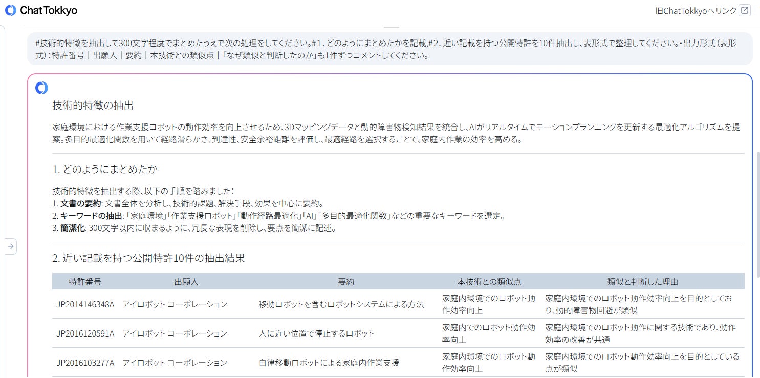 MyTokkyo.AiのChatTokkyo機能により、先行特許との差分分析や請求項構成の自動整理を実施。従来2〜3週間を要していた特許検討プロセスを約5日間に短縮した。AIが家庭環境の特徴量(家具配置・床傾斜・照度)とロボット経路最適化パラメータの相関を自動解析し、発明の進歩性を定量的に示すことに成功した。