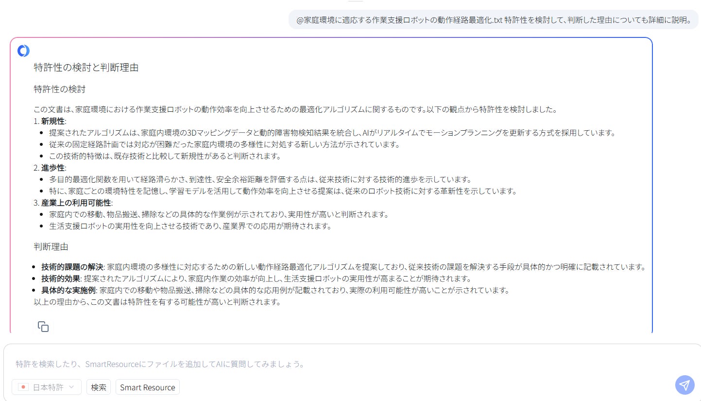 「MyTokkyo.Ai」は、センサログ、マップデータ、経路探索アルゴリズム仕様などの技術情報を解析し、AIが発明の本質を抽出する機能を有する。本件では、ロボットの経路生成ログを入力し、AIが「環境適応学習」「滑らかさ評価関数」「動的再計画処理」の3構成を自動抽出。先行特許との差異(家庭内環境を学習する適応更新機構)を明示し、発明提案書から出願ドラフトまでの工程を効率化した。