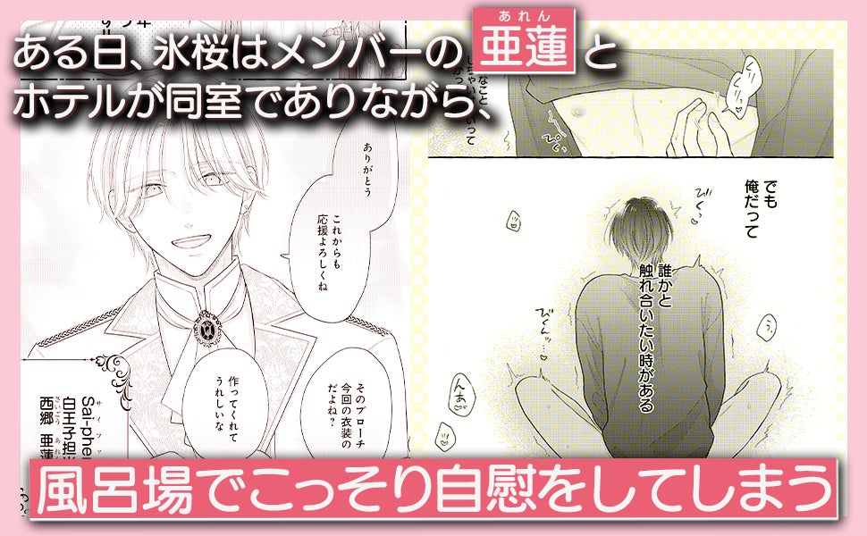 憧れを胸に秘めて活動を続けていたある日、氷桜はメンバーの亜蓮(あれん)とホテルが同室でありながら、風呂場でこっそり自慰をしてしまう。