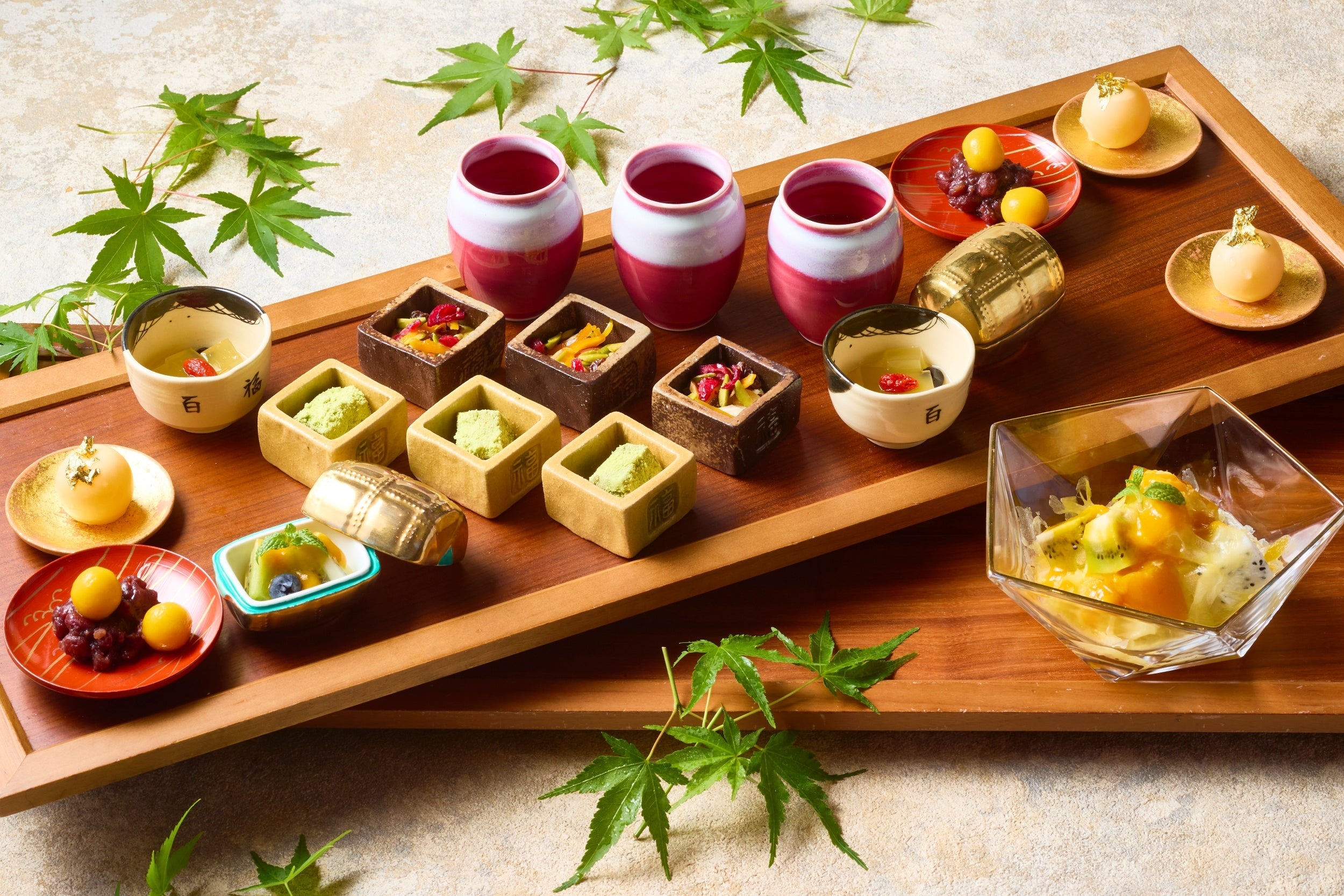 「旬華」は、日本料理 華暦の夜の会席コースから選りすぐった料理をもとに、昼の時間帯にふさわしい構成へと再編したメニューです。旬の食材を生かすことはもちろん、神奈川・三浦半島や相模湾をはじめとする地場の恵みを積極的に取り入れ、この土地ならではの季節の表情を映し出しています。また、料理の締めくくりには、甘味ワゴンをご用意。お好みの一品を選ぶ楽しみが、食後の時間に彩を添えます。“旬”の味わいと、“華”やぎのある余韻。その名に込めた2つの要素を、初夏から盛夏にへと移ろう季節の中で、涼やかにご体験いただけます。