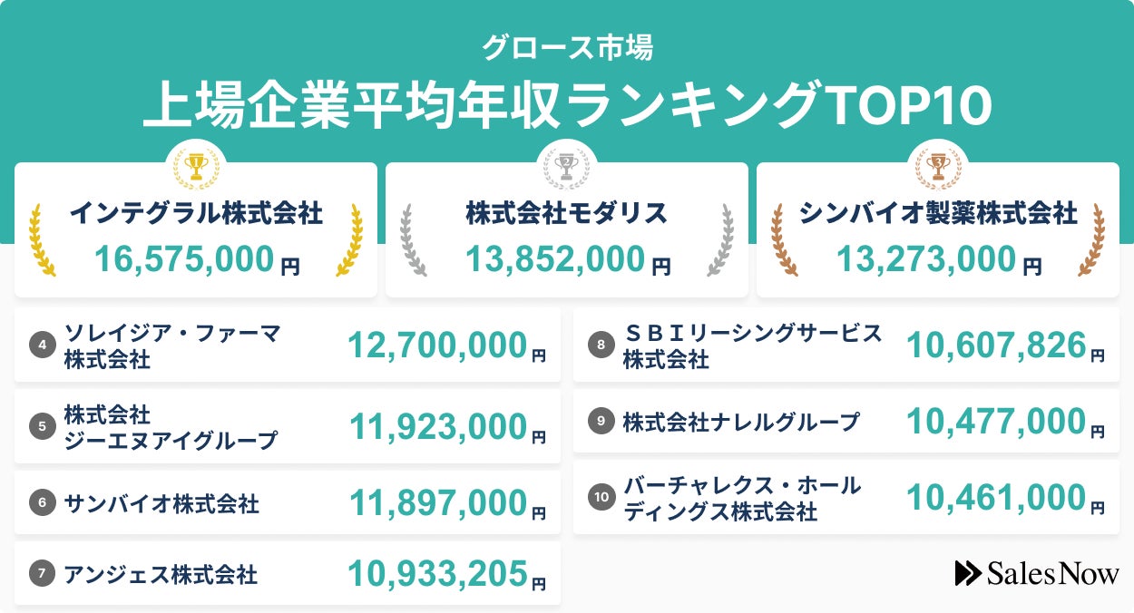 「上場企業(グロース市場)」の平均年収ランキングTOP10を発表!/SalesNow DBレポート
