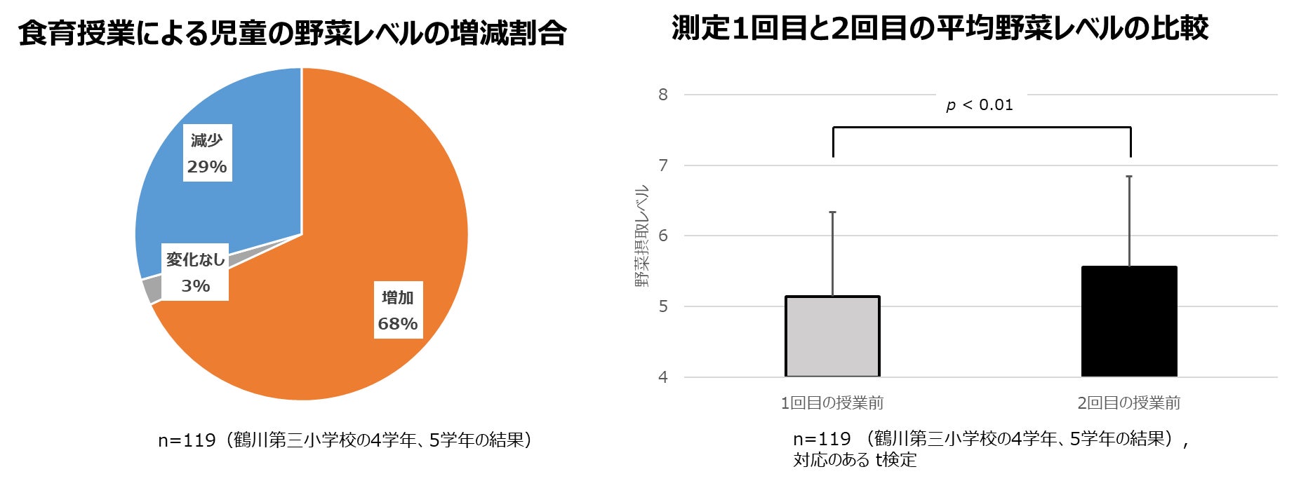 また、児童に対して実施したアンケート調査では、9割以上の児童が、食育授業後に意識して野菜を食べるようになったと回答し、保護者に対するアンケートでも、約6割の家庭で児童から野菜摂取の要望があったとの結果が得られました。