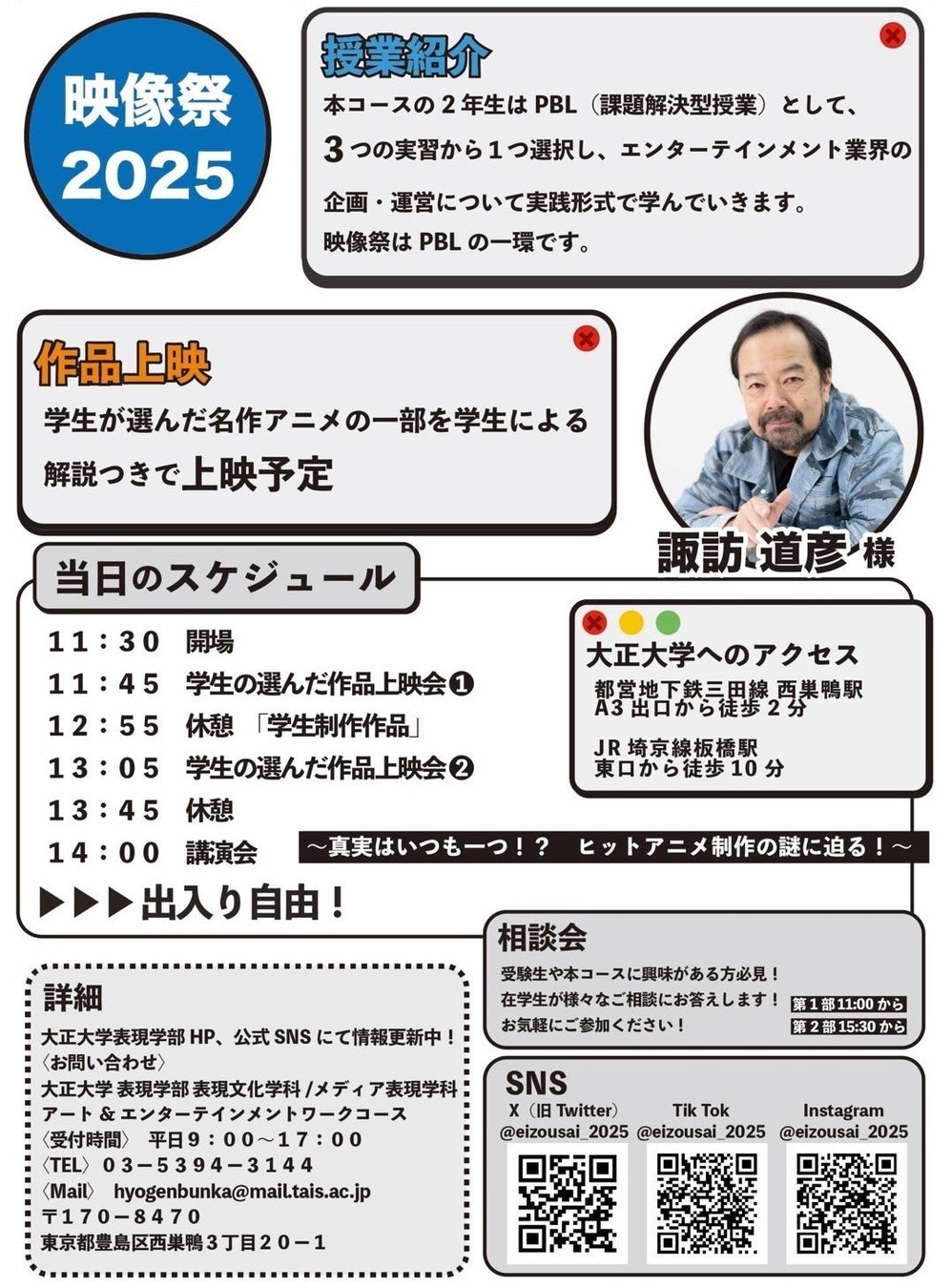 大正大学(学長:神達知純、所在地:東京都豊島区)では、2025年11月1日(土)に表現学部 メディア表現学科 アート&エンターテインメントワークコースの2年生が主体となり、PBL(課題解決型学習)の一環として、学生が企画・運営する毎年恒例のイベント「映像祭2025〜真実はいつも一つ!? ヒットアニメ制作の謎に迫る!〜」を開催します。