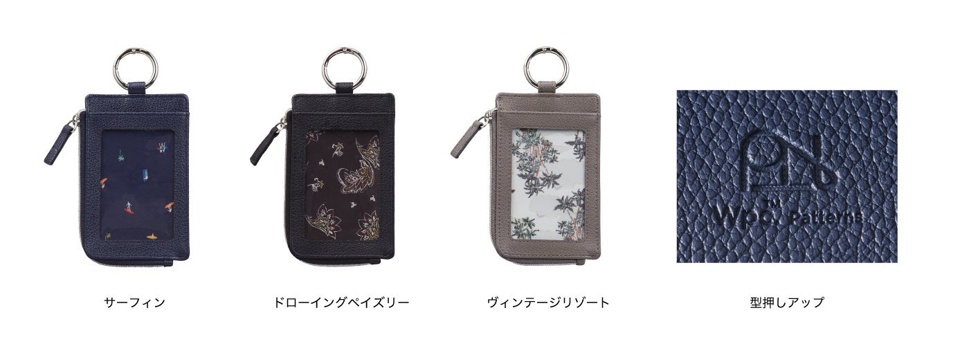 シンプルで男女を問わず使いやすいデザインのパスケースは、ブランドロゴをさりげなく型押しした高級感のある仕上がり。カードを出し入れするたびに見え隠れする内側のテキスタイルがアクセントとなり、さりげないこだわりを楽しめます。大きめの丸カラビナ付きでバッグにも取り付けやすく、ファスナー付きで鍵や小銭も入れられる便利なアイテムです。