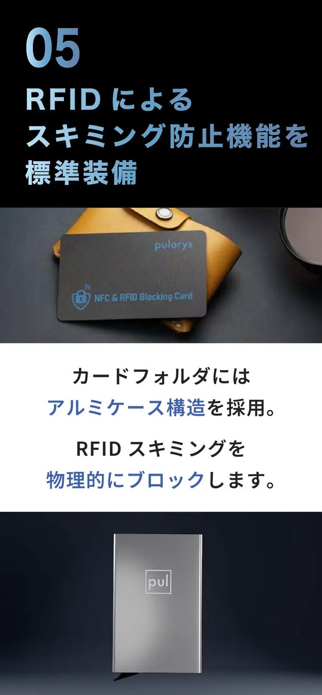 ☑ RFIDスキミング防止機能内蔵で、カード情報を物理的に保護