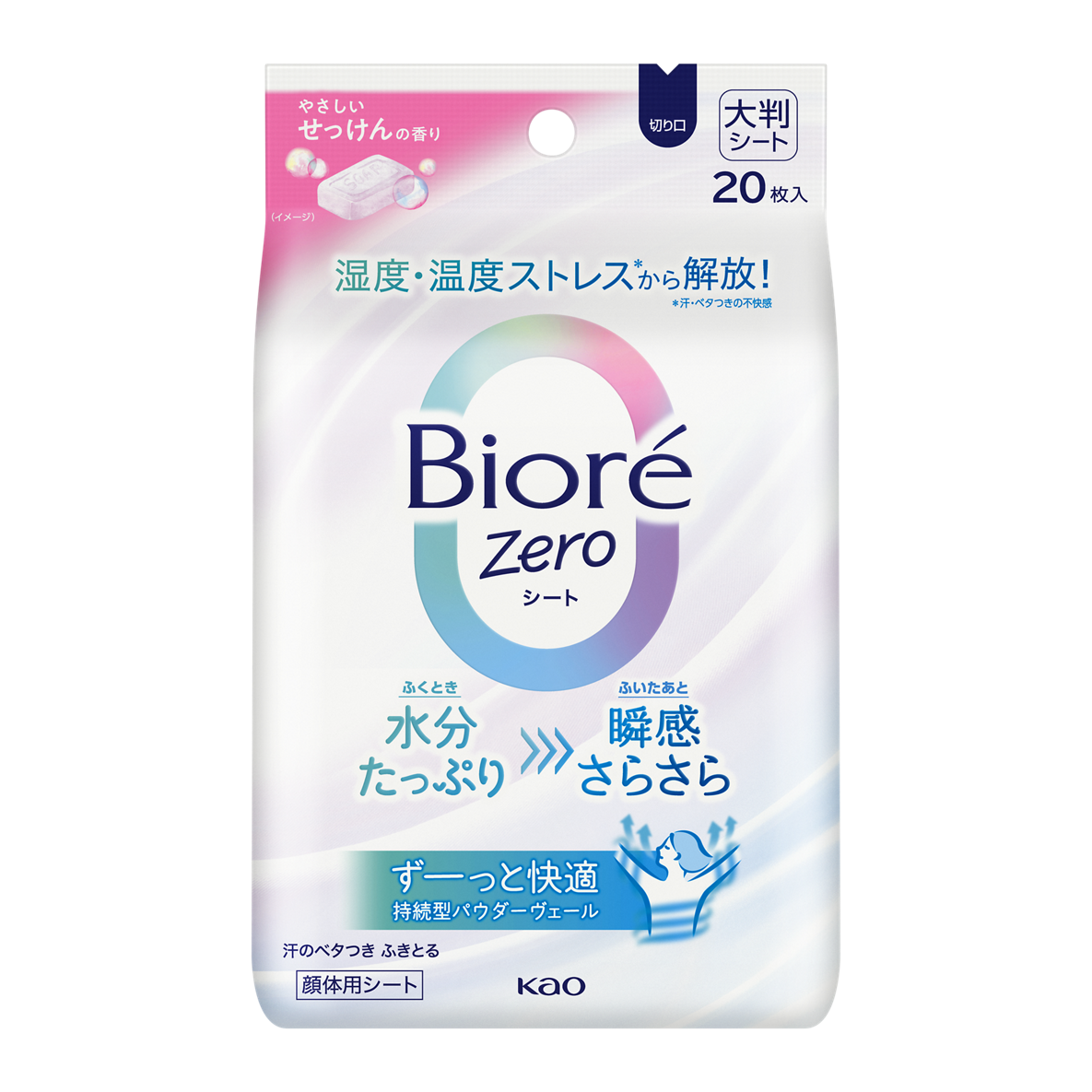 『ビオレZero シート』は、「肌をふくときは液たっぷり」、そして「ふいた後は、パウダーで瞬感さらさら」、さらに高温多湿環境でも快適が持続する「次世代型シート」です。ビオレの従来シート*3では実現できていなかった、たっぷりの液を含浸しながら、パウダーを高配合するという2つの機能を両立しています。今回搭載した花王の新技術は、汗を乾かし続ける「高蒸散パウダー」がヴェールのように肌を包み込む「持続型パウダーヴェール」。これによりさらさら感が長時間持続します。朝、外出前に使用することで、通勤・通学、日中の活動時に汗をかいても快適が続きます。