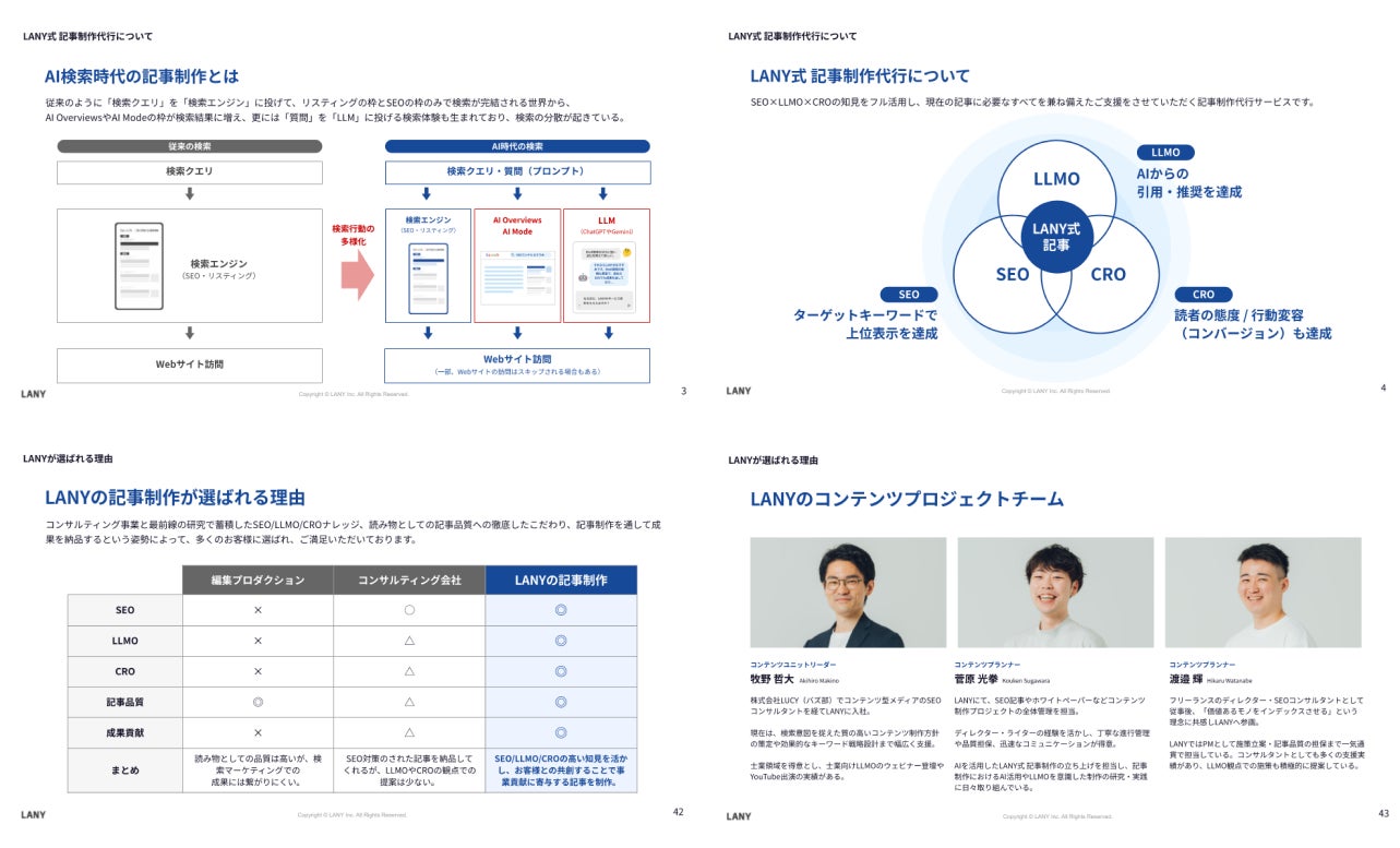 そこでLANYは、コンサルティング会社として蓄積したSEO×LLMO×CROの知見を活かし、SEOでの上位表示の獲得に加え、AIへの学習材料として機能すること(LLMO/大規模言語モデル最適化)、さらに訪れたユーザーのアクションを適切に喚起すること(CRO)を実現する「AI時代に最適化した記事制作」として「SEO/LLMO記事制作代行サービス」をリリースいたしました。