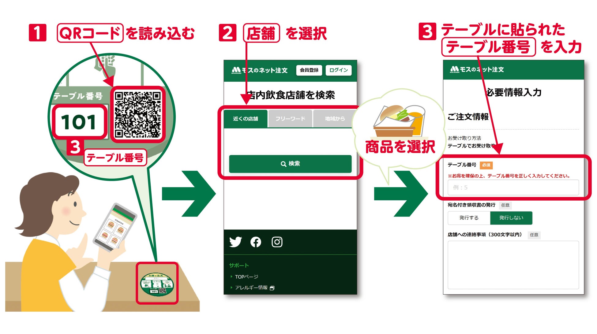 「お席で注文」は「モスのネット注文」を拡張した機能で、店内飲食(イートイン)の際にお客さまがテーブルの二次元コード(右表示)をスマートフォンやタブレットで読み込むことで、お席にいながら注文できます。決済方法はクレジットカード※2、dポイント、d払い、PayPay、Apple Pay、モスカードにより行います。注文した商品は、スタッフがお席までお届けします。