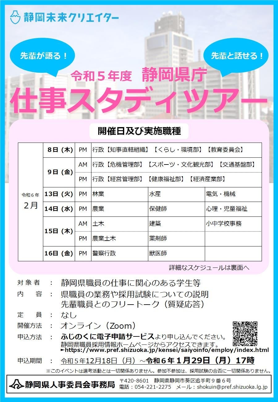 静岡県は、静岡県職員の仕事に関心があり、県職員採用試験の受験を検討している方を対象に、「静岡県庁 仕事スタディツアー」(業務説明会)を開催します。