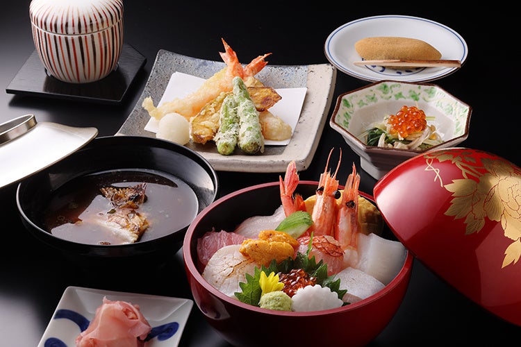 丼の蓋を開けるとまるで魚介の玉手箱。鯛、鮪、鰤、帆立貝柱、甘海老、雲丹、いくらなど、つややかで色とりどりの具が豪快に盛り付けられた「海鮮丼」に心が躍るランチ。海の滋味を感じられる「魚と青さの赤出汁」や、天麩羅、茶碗蒸しなど脇役も充実しています。