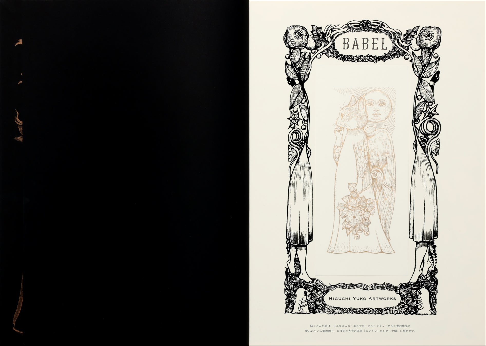 扉ページに貼り込んだ絵は、ヒエロニムス・ボスやピーテル・ブリューゲル1世の多くの作品に使われている銅版画とほぼ同じ方式の印刷「エングレービング」で刷りました。紙や印刷にもこだわり、半分の作品に箔押しを加工。ヒグチユウコ自身が、原画を描いたあとに、箔押し用の新たな原画を描き下ろしています。