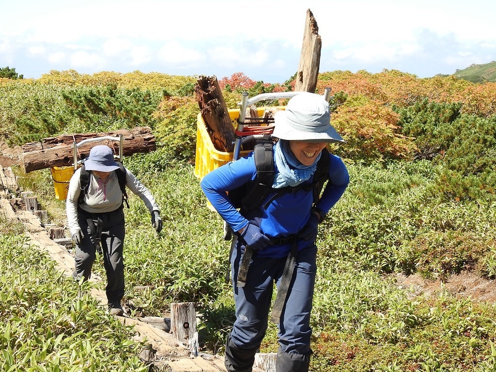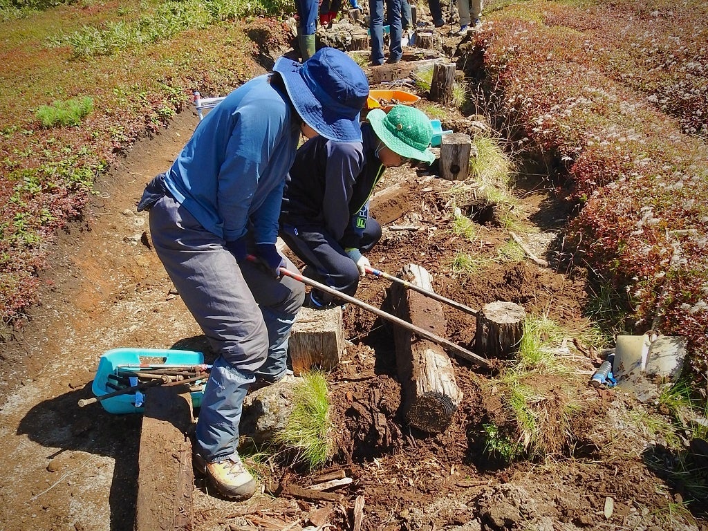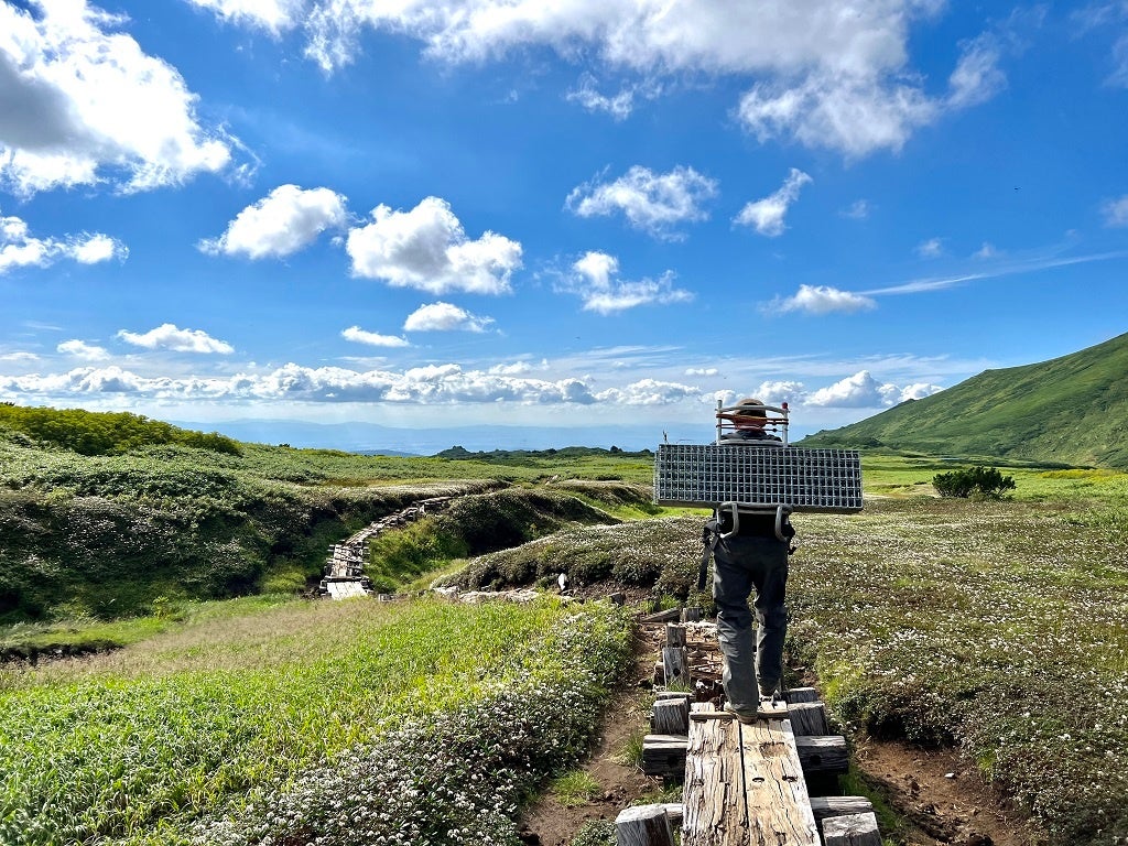 2022年から、この裾合平の植生復元のために、そして登山道の荒廃を止めるために、一般登山者が参加できる登山道補修イベントを開催し、補修が必要な約600mの木道のうち約290m分を手当できました。補修計画は、200万円×4年としており、本年度はその3年目に当たります。