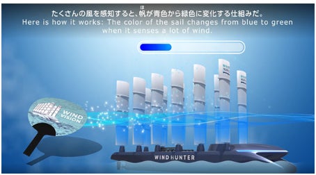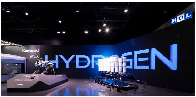 ②オリジナル映像:大型スクリーンで常時投影する5つの映像は、「水素社会を創る」「無限の風を活かす」「ものづくりを繋ぐ」「暮らしの価値を生む」「未来を動かす」のテーマからなり、船と社会や産業、人との関わりを表現、海運業をより身近に感じられるコンテンツです。また、水素を生産するウインドハンターと、川崎重工業株式会社が展示する水素燃料次世代モビリティ(註3)が登場するコラボ映像を、両者のスクリーンを合わせた長さ17mの迫力ある画面で投影します。
