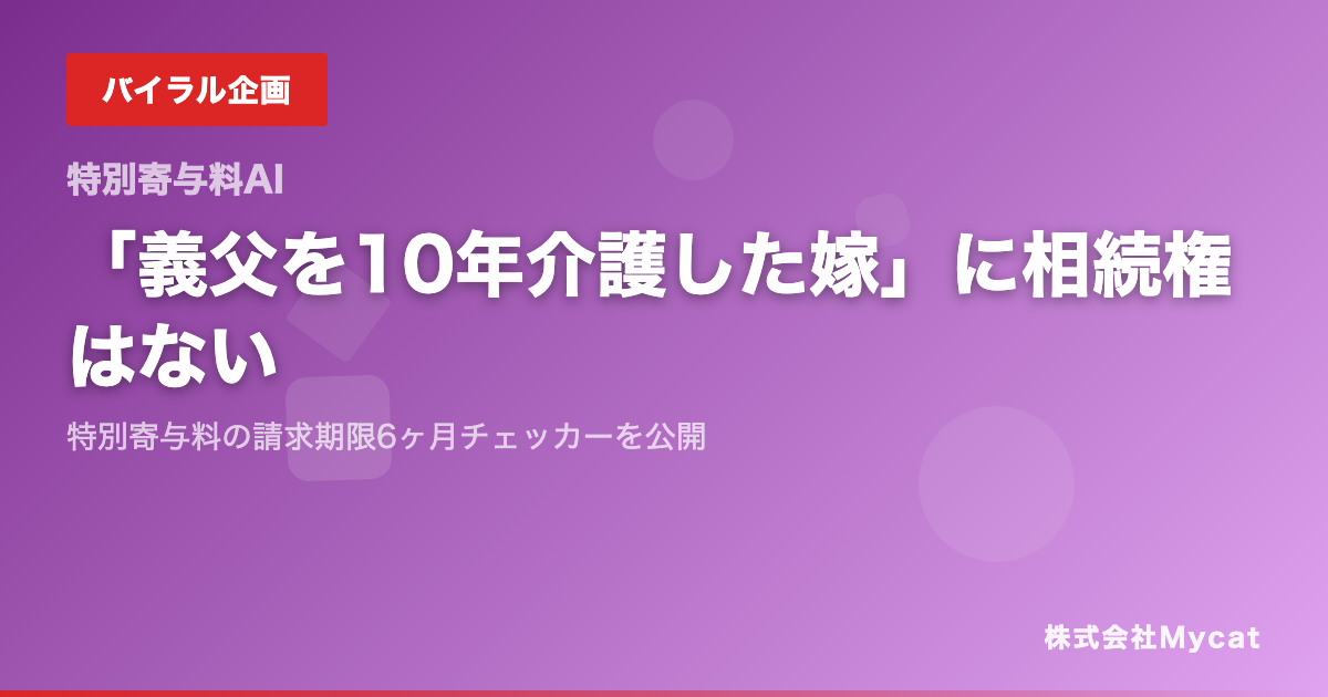 株式会社Mycatは、この期限管理の問題を解消するため「特別寄与料 請求期限6ヶ月チェッカー」を新たに公開した。