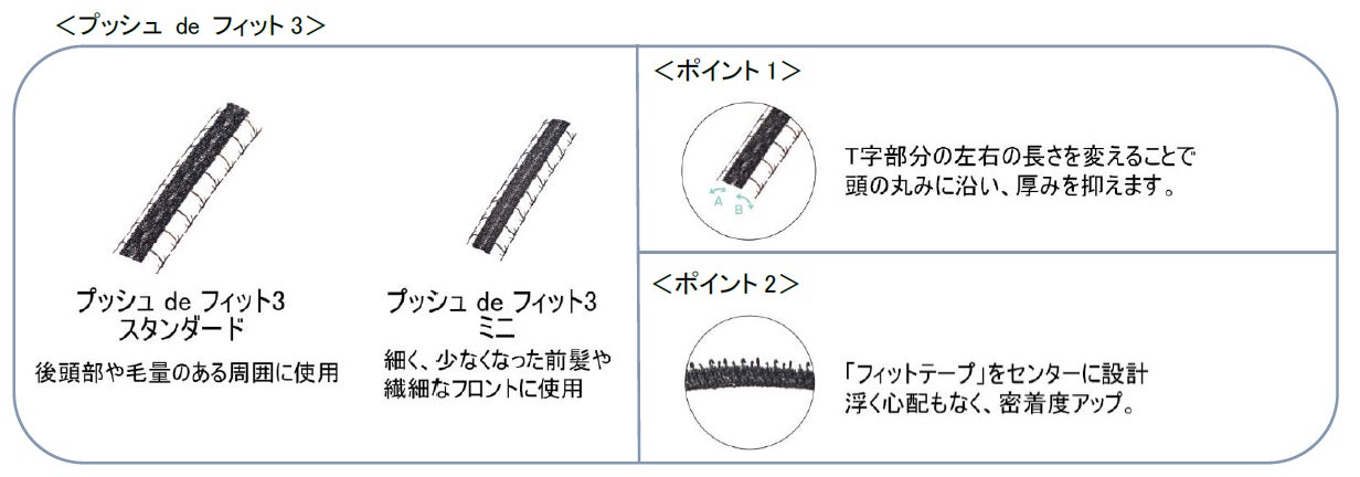 後頭部や毛量のある周囲の自毛にしっかりからむ「スタンダード」と、細く、少なくなった前髪や繊細なフロントの浮きを抑えながらフィットさせる「ミニ」の2タイプを採用。「プッシュ de フィット」のT字部分の長さを変えることで、頭の丸みに沿いやすくなり、厚みを抑えます。さらにセンター(中心)部分に自毛をしっかりキャッチするフィットテープを採用。より密着度をアップさせました。