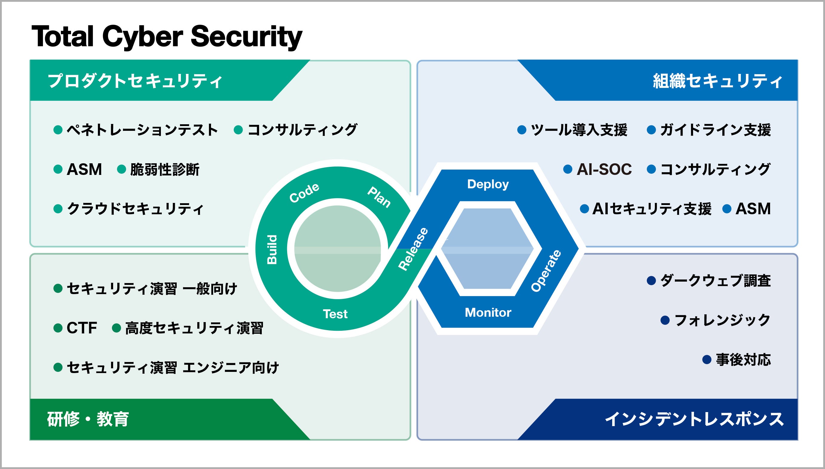 平時のセキュリティ対策である各種脆弱性診断やコンサルティングから有事のセキュリティ対策であるフォレンジックや事後対応を提供するとともに、生成AIの利用に関するセキュリティコンサルティングやAIを用いたSOCの自動化、ASM、AI Monitoringを提供しています。