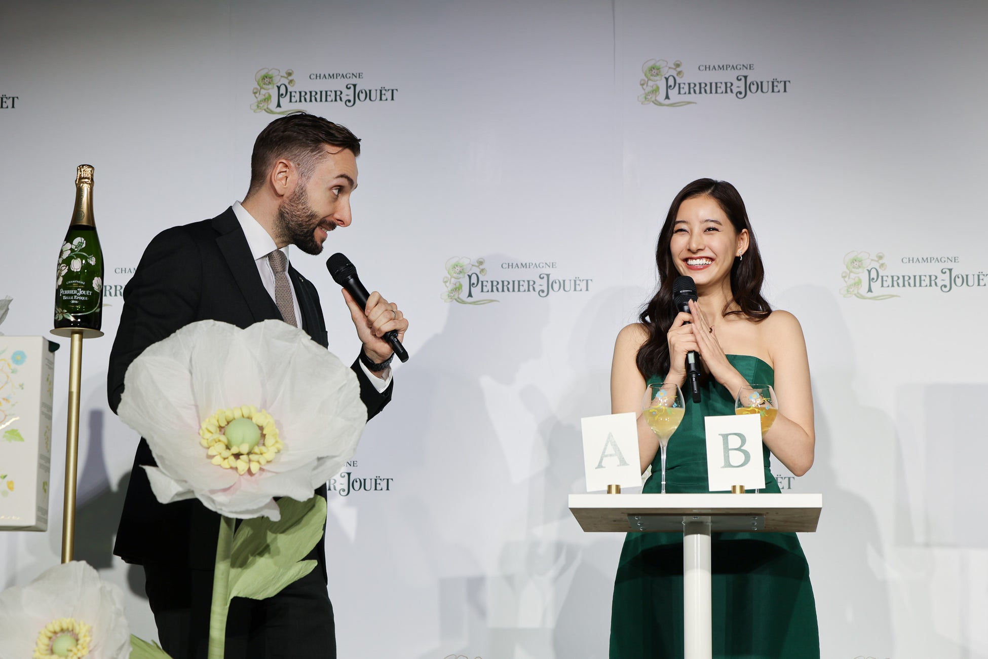 さらに、マルシン・ルサック氏より、新木さんのペリエ ジュエ ジャパンアンバサダー就任1周年を迎えたお祝いとして、特別なアートピースをプレゼント。そして、今回のPOP-UPで体験できる、希少な4種のヴィンテージ・キュヴェを年代順に愉しめる貴重なセッション「プレスティージライン ヴァーティカル テイスティングセミナー」にちなみ、利きシャンパンを実施。最も新しいヴィンテージである 「ペリエ ジュエ ベル エポック 2016」と、最も熟成を重ねた「ペリエ ジュエ ベル エポック 1999」2つのシャンパーニュを飲み比べてどちらがどの年代かを当てていただき、見事正解!