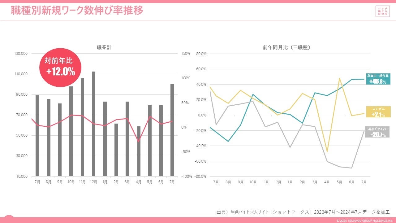 2.新規ワーク数は、前年比+12.0%。主要職種では倉庫内・軽作業が前年比+46.8%と伸長。