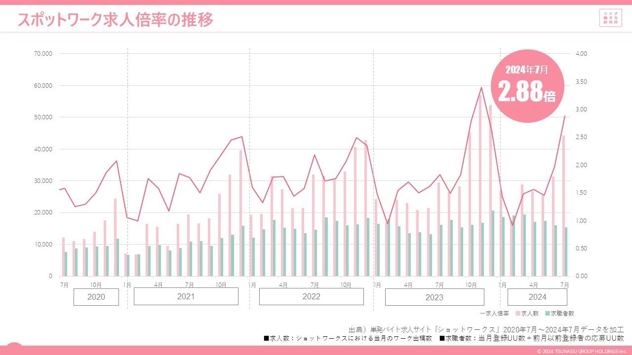 2024年7月度のスポットワーク求人倍率は2.88倍で、前月差+0.92ポイント、前年差+1.05ポイントと、前月/前年ともに求人数が増加したことによって求人倍率も大幅に上昇しました。
