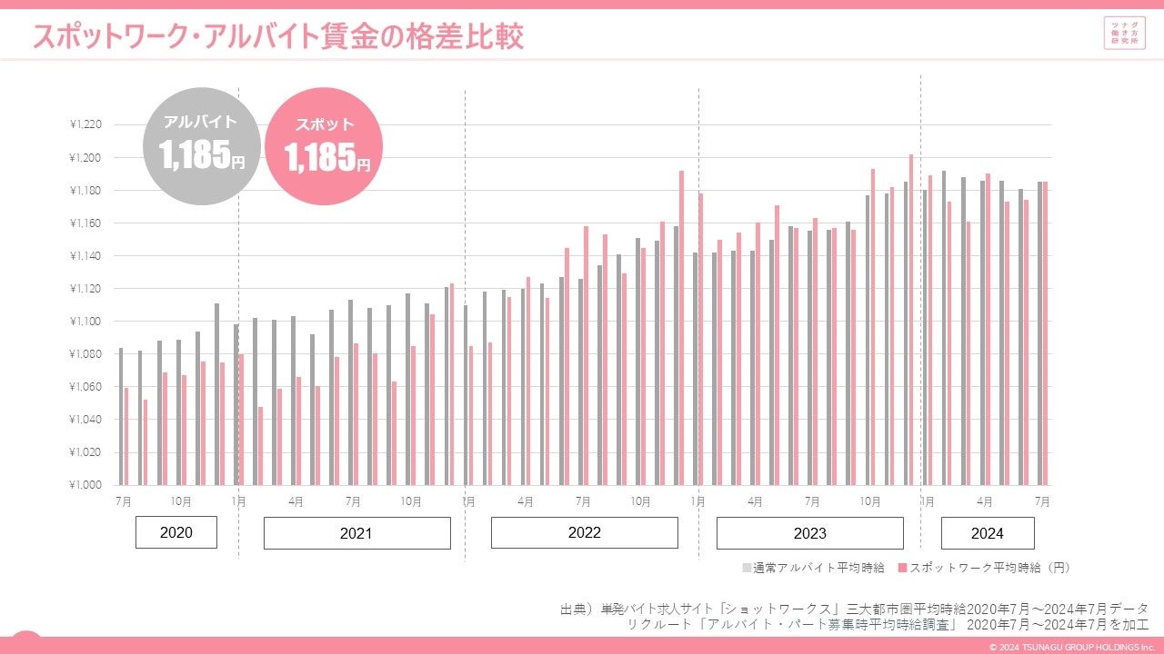 2024年7月度のスポットワーク平均時給(首都圏・関西圏・東海圏の3大都市圏)は1,185円。前月差+11円、前年差+22円となりました。通常のアルバイト平均時給1,185円(※リクルート発表「アルバイト・パート募集時平均時給調査」)と、2018年1月より定点観測を始めて以降、初めて同額という結果となりました。