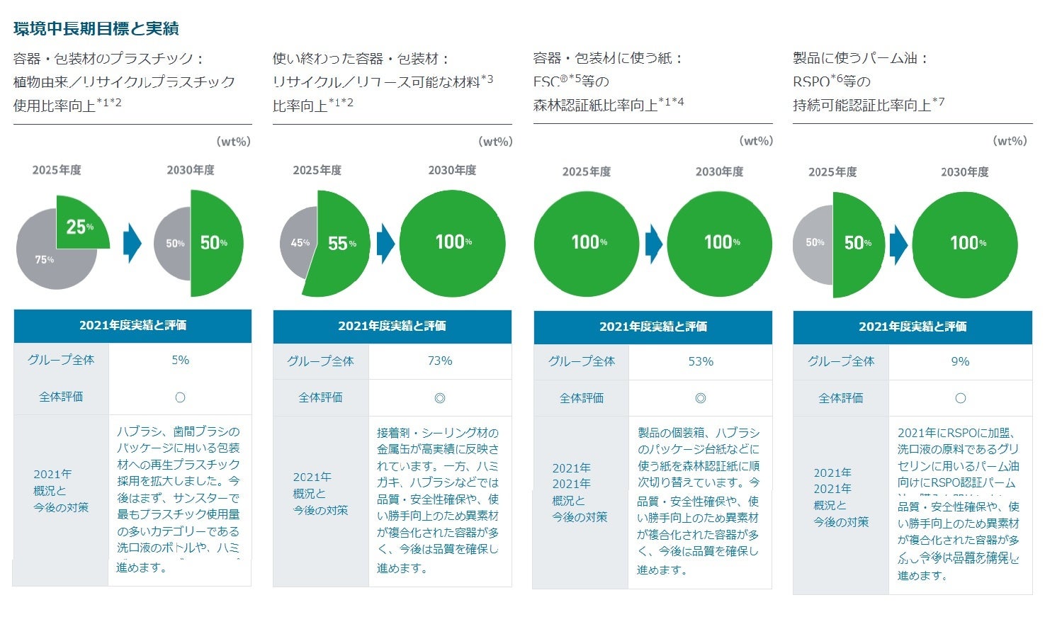 2021年に発表したサンスターグループ環境中長期目標の達成に向け、資源循環(サーキュラーエコノミー)やカーボンニュートラルへの貢献を加速しています。具体的な取り組みの主な成果は以下の通りです。