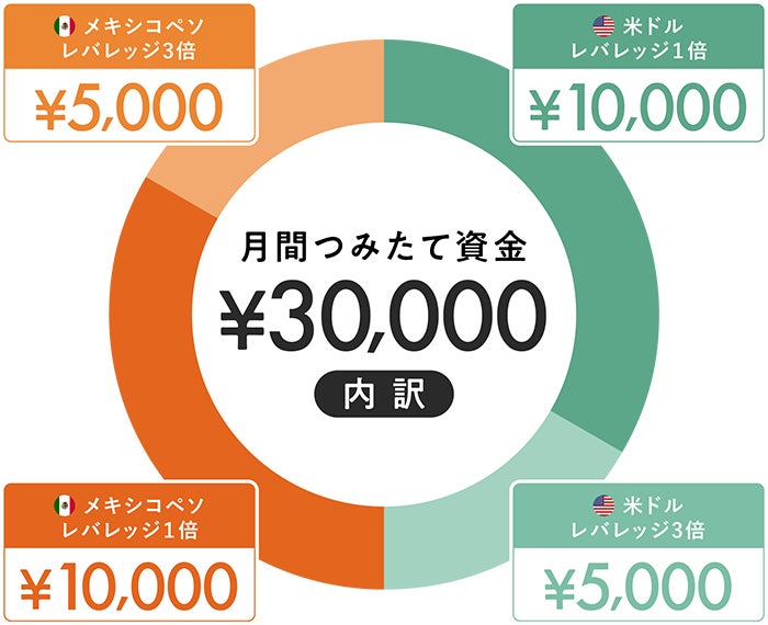 外貨といえばまず思い浮かぶ「米ドル」と、スワップポイントを狙って高金利通貨の「メキシコペソ」を選択してみました。リスクを抑えたレバレッジ1倍で運用しつつ、FXの仕組みを活用したつみたて外貨ならではのレバレッジ3倍で投資効率も上げて運用したいと思います!