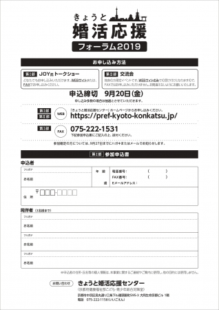 ・メールの場合は、タイトル「きょうと婚活応援フォーラム2019【第Ⅰ部】」と以下の①~⑥を明記の上、申込アドレス「konkatsu02@pref-kyoto-konkatsu.jp」までお申し込みください。